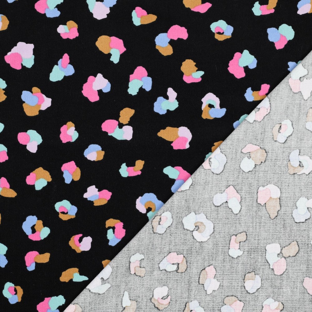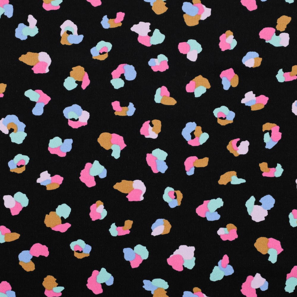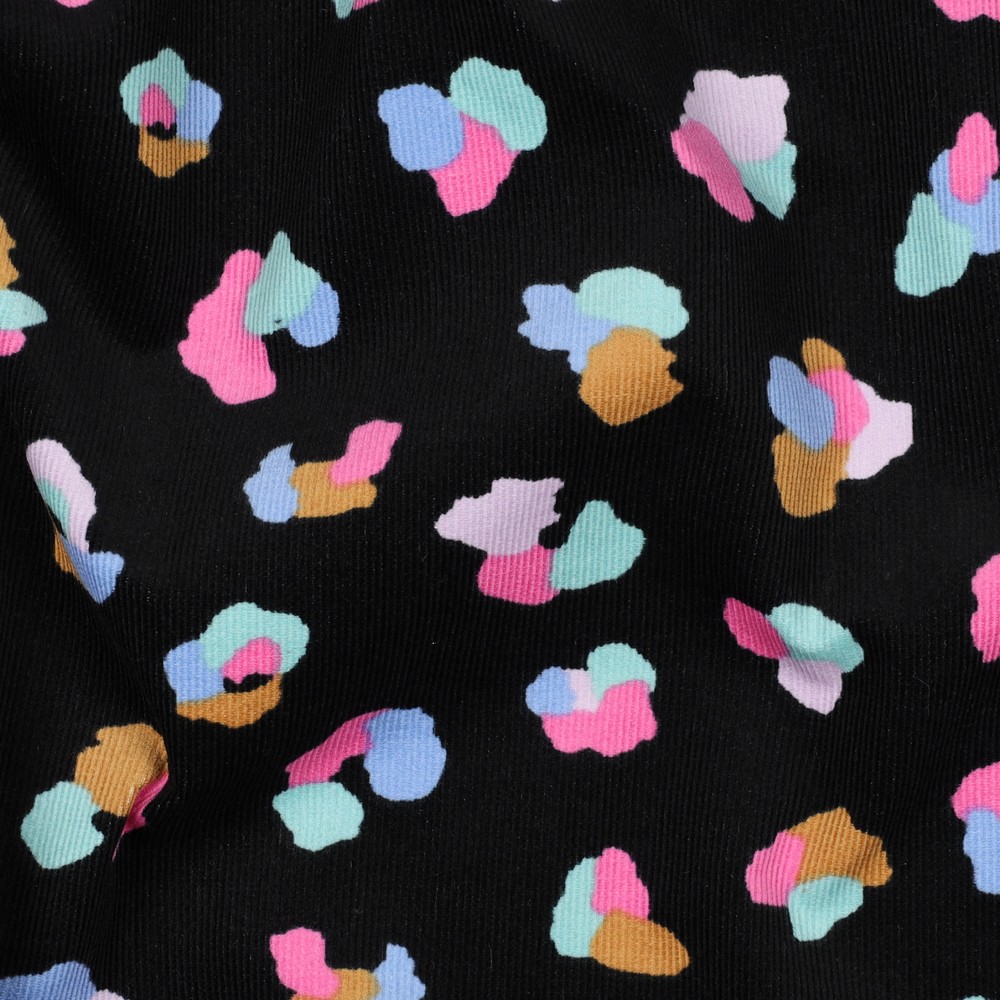 Tento babycord přináší barvu a dobrou náladu do každého šicího projektu: Na temně černém pozadí se hemží živý vzor leopardí kůže v zářivých barvách – od teplé oranžové a výrazné růžové přes zářivou žlutou až po svěží modrou a tyrkysovou. Malé, nepravidelné tečky působí jako ručně kreslené a dodávají klasickému leopardímu designu moderní, hravý vzhled.