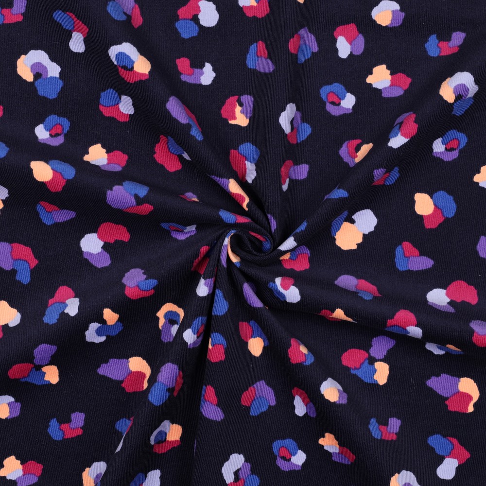 Tento babycord přináší barvu a dobrou náladu do každého šicího projektu: na tmavě modrém pozadí se pohybují moderní leo skvrny v veselých tónech – od teplé hořčicové přes jemnou růžovou až po výraznou modrou a decentní šedou. Stylový leo vzor působí hravě, ale zároveň elegantně, což ho činí ideálním pro všechny, kdo hledají zvláštní kousek do šatníku.