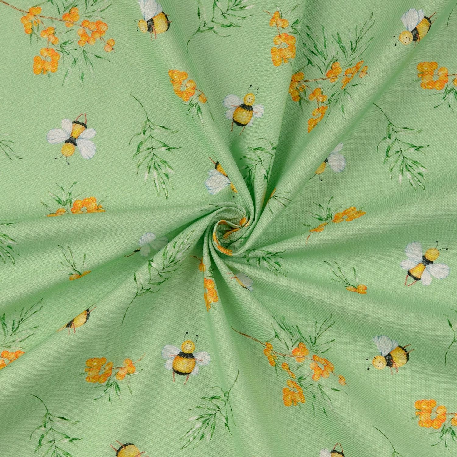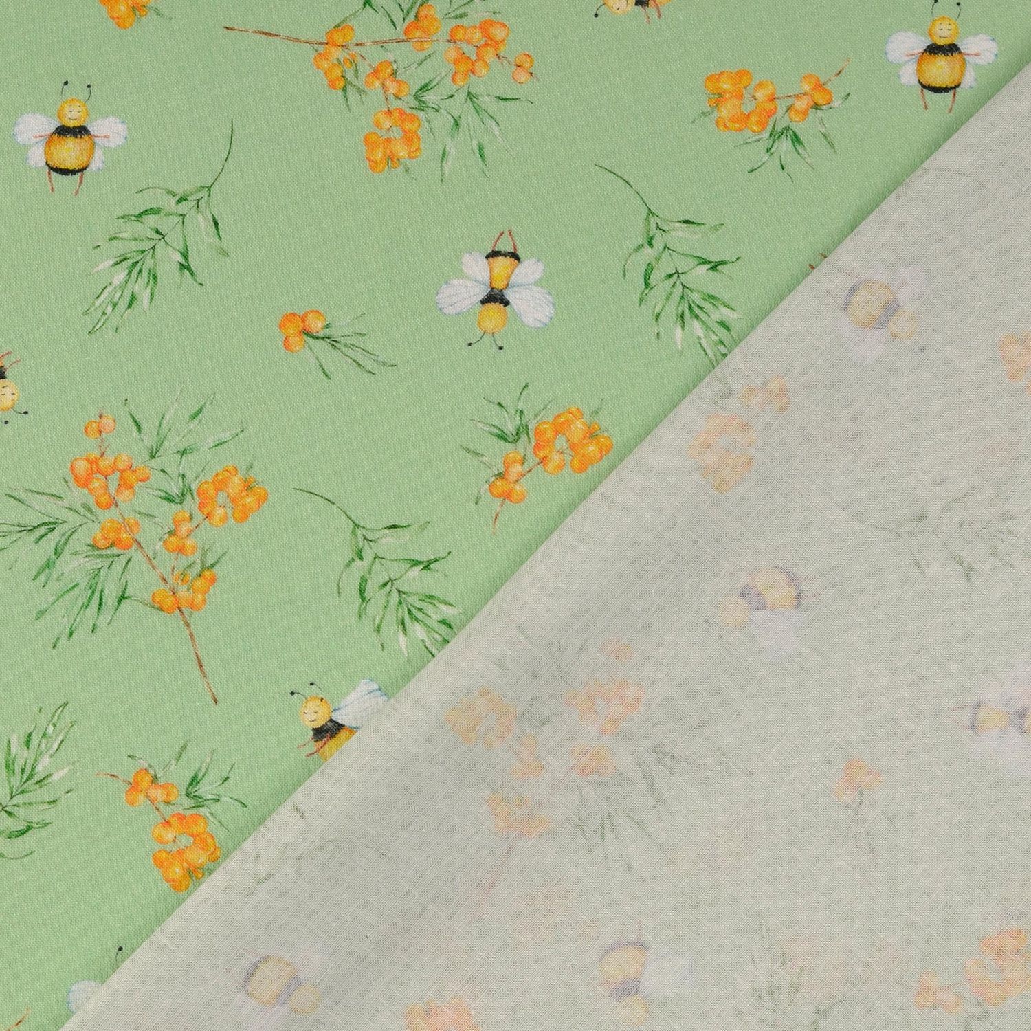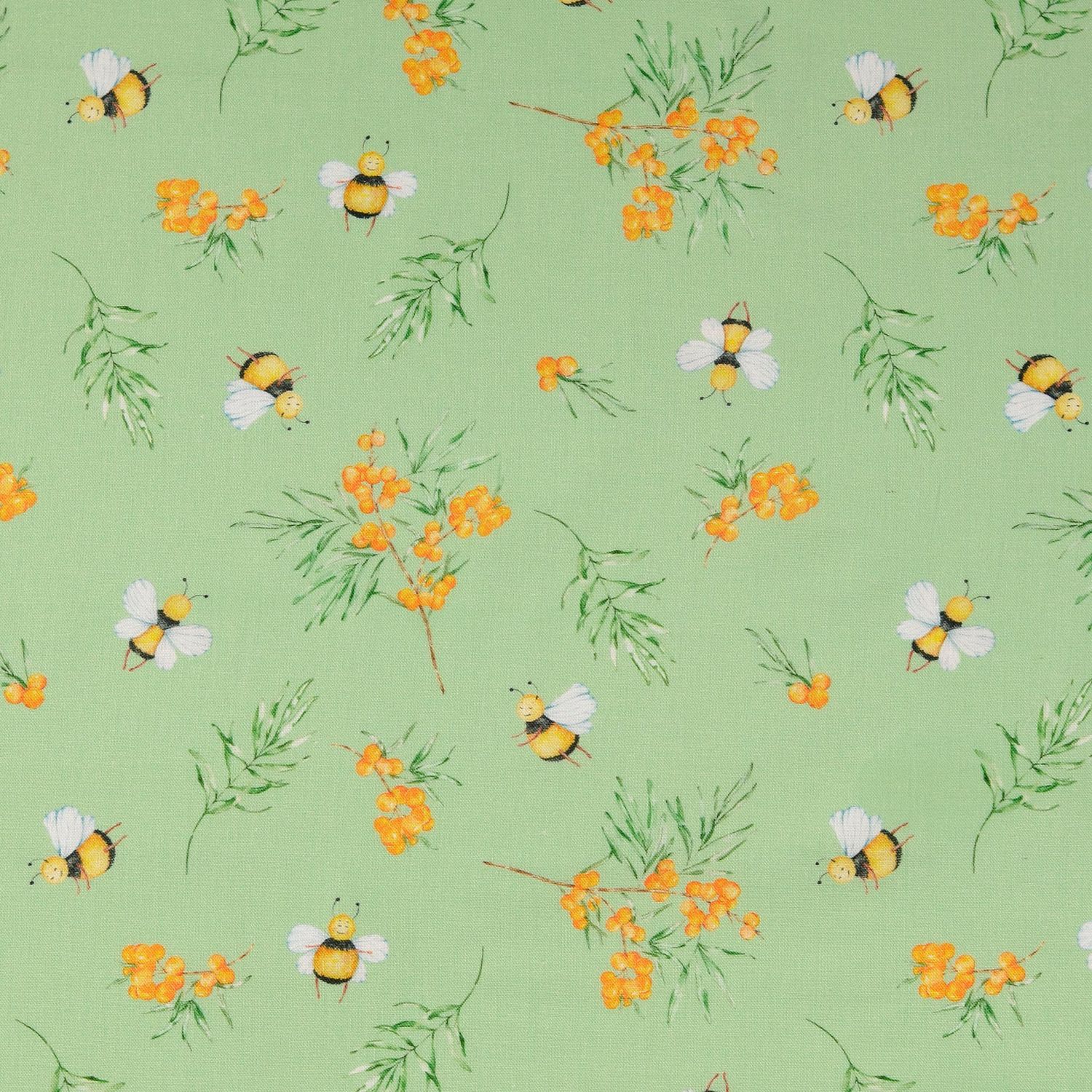 Bavlněná kretonová látka - digitální tisk Čmeláci a bobule Mint
