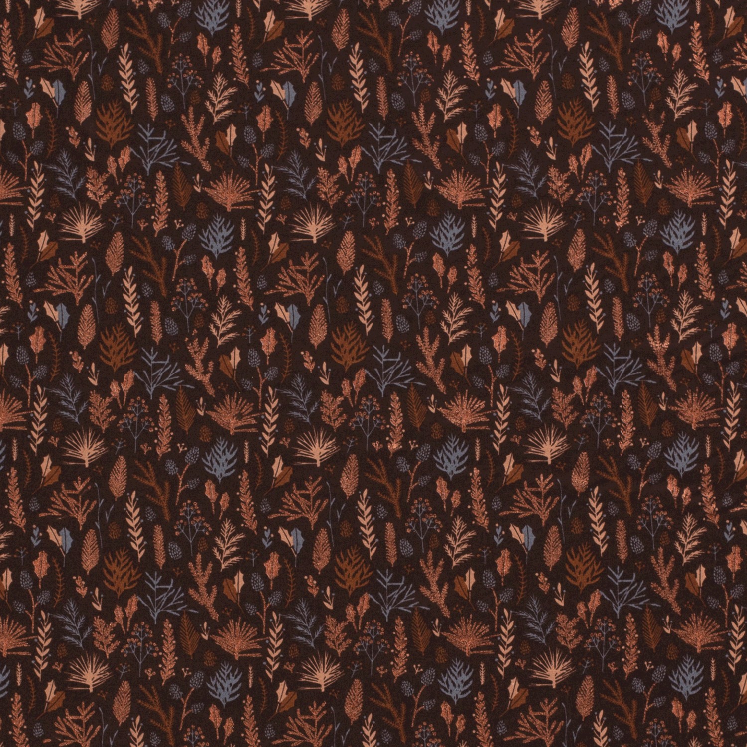 Elegantní kousek pro tvé šicí projekty: Na teplé červenohnědé se v lesklém foliovém potisku vlní jemné trávy a něžné větvičky po látce. Jemné listy vypadají, jako by byly ozdobeny zlatým nádechem a dodávají designu elegantní, téměř podzimní vzhled – ideální pro všechny, kdo milují přírodní motivy s nádechem lesku.