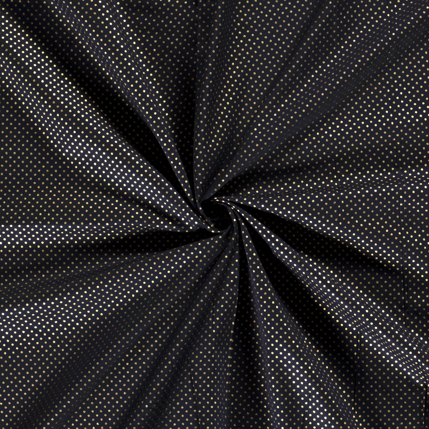 Sváteční látka jako jasná zimní obloha: na temně modré září nespočet jemných zlatých puntíků jako malé hvězdy. Vznešený zlatý potisk decentně třpytí ve světle a dodává tvým šicím projektům elegantní vánoční nádech – ideální pro všechny, kdo mají rádi stylově, ale bez kýče.