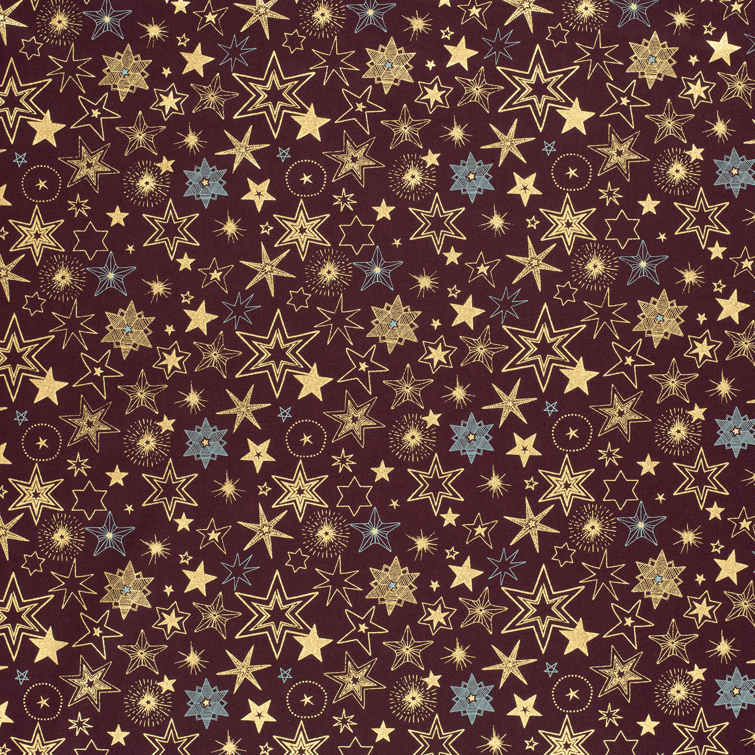 Látka jako jasná zimní noc: hravá směs zlatých hvězd různých velikostí září na tmavě vínovém pozadí. Jemné tečky a malé hvězdičky se setkávají s většími zářícími hvězdami a vytvářejí živý a zároveň harmonický vzor.