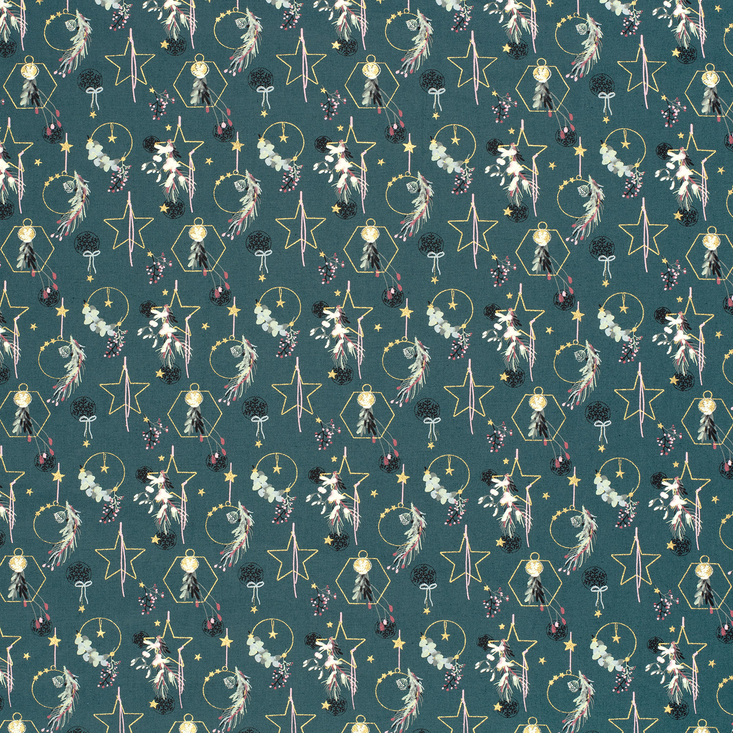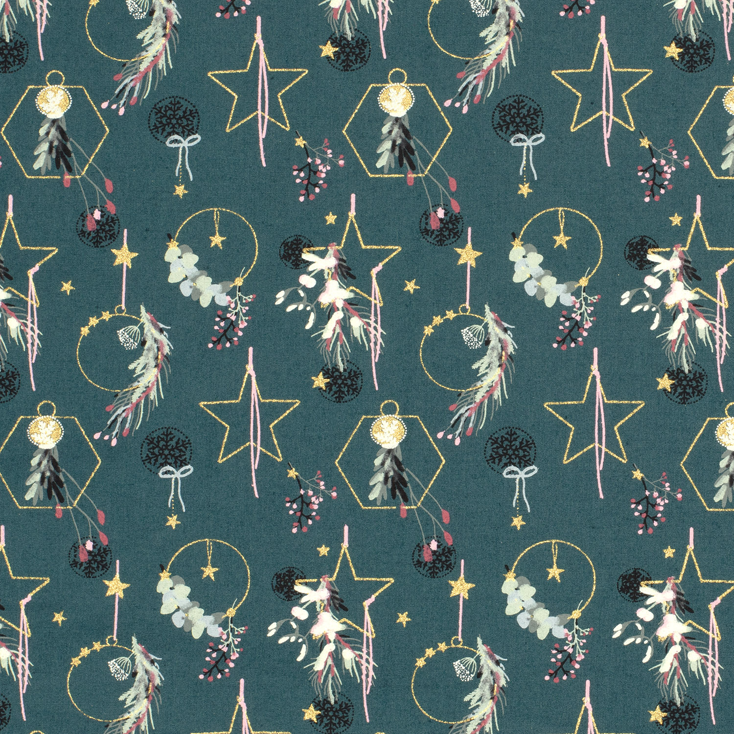 Tato slavnostní látka přináší kouzlo vánočního času přímo na váš šicí stůl. Na elegantním petrolejově zeleném pozadí září jemné zlaté vánoční motivy, které jako malá světýlka září. Hvězdy, vánoční koule, větvičky a jemné ornamenty působí, jako by byly pečlivě naaranžovány ručně – ideální pro ty, kteří mají rádi stylově a přesto vánočně útulně.