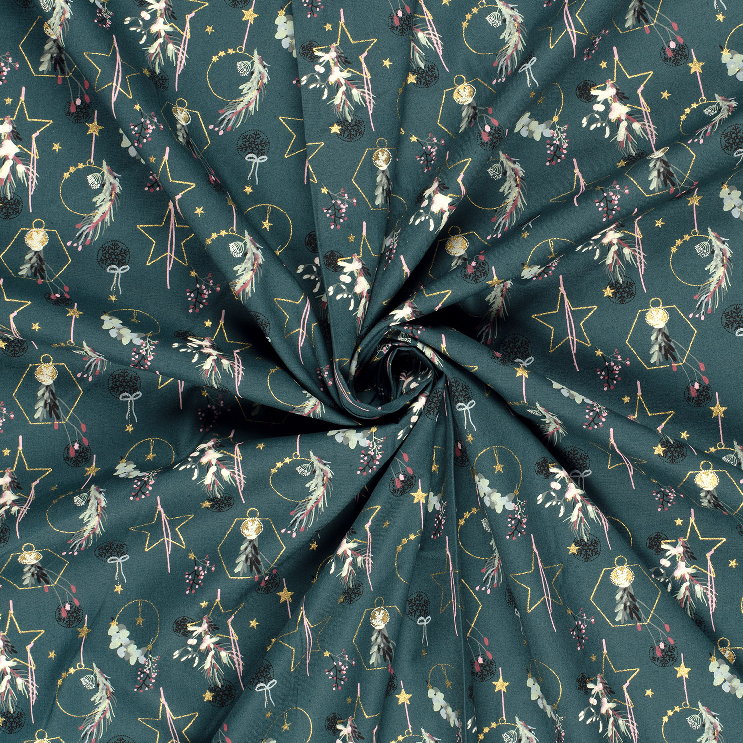 Bavlněný popelín - vánoční dekorace petrolejově zelená zlatá