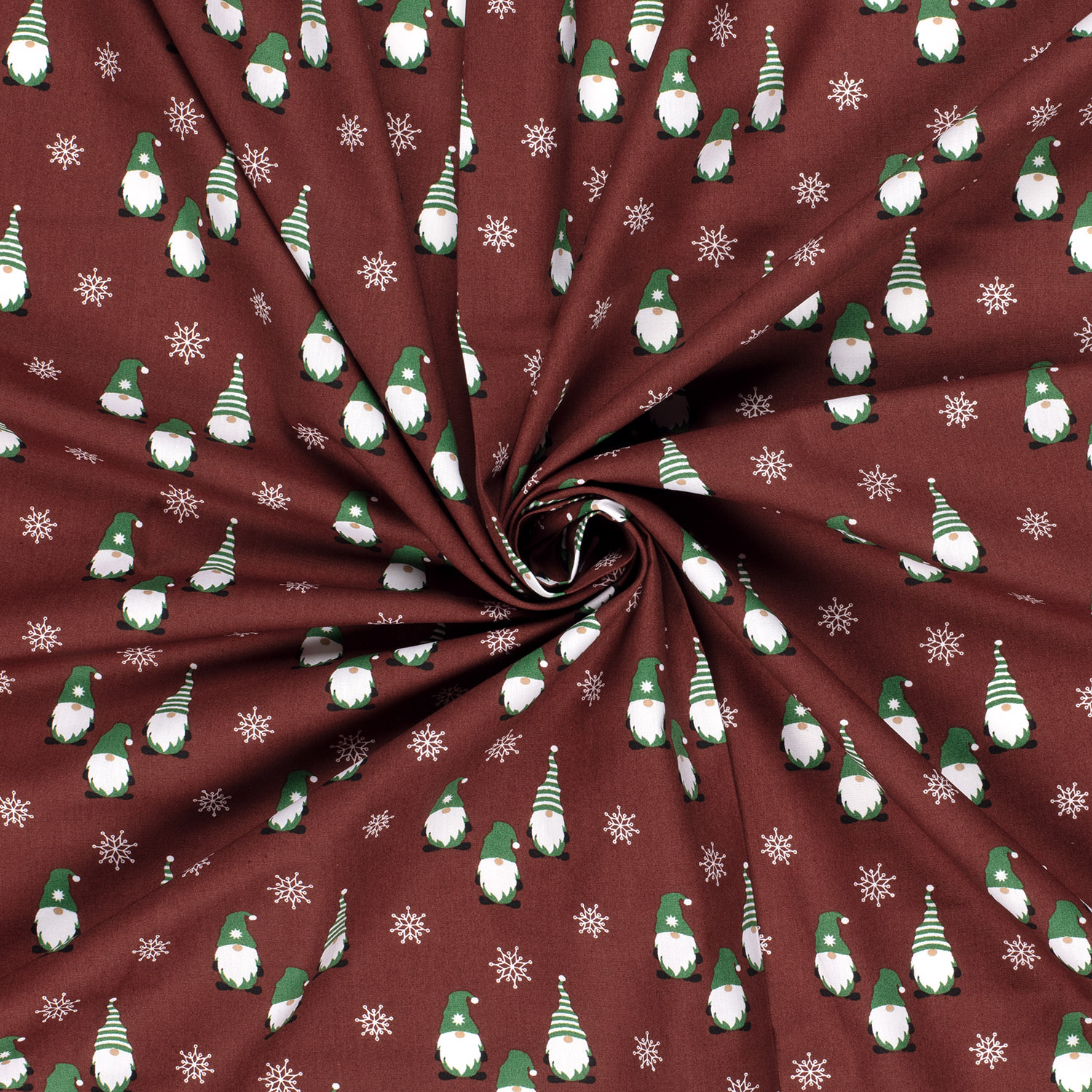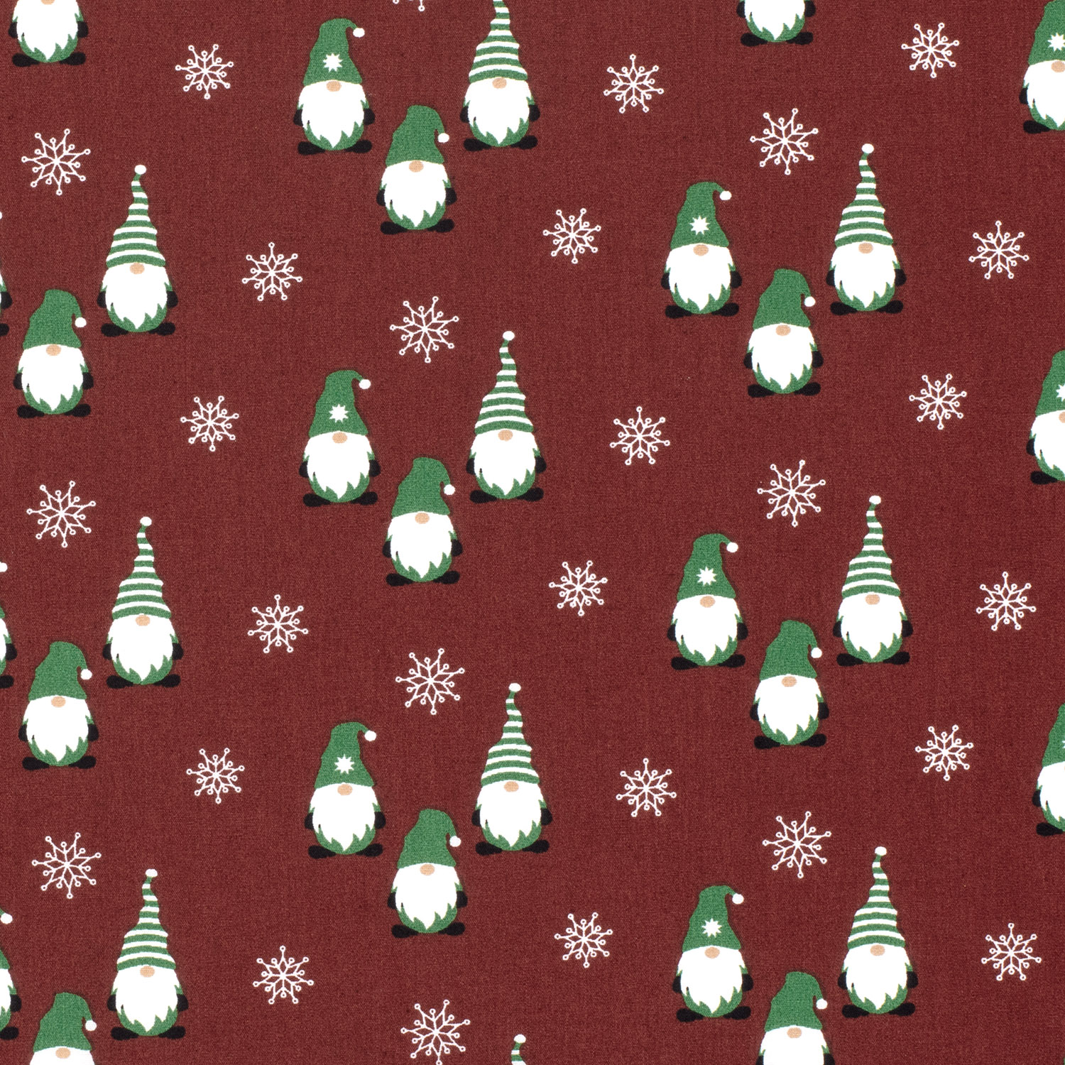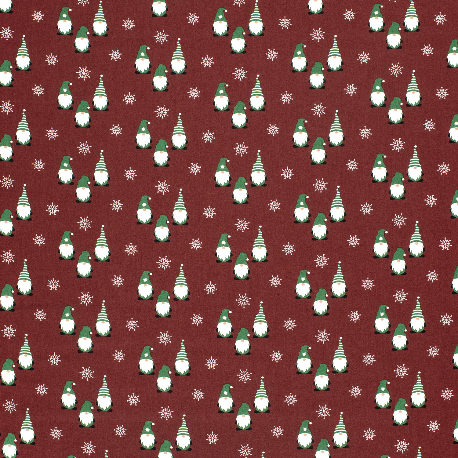 Tkanina jako z vánoční dílny: Na tmavě bordó pozadí se hemží veselé vánoční skřítky, láskyplně ilustrované s dlouhými špičatými čepicemi, nadýchanými vousy a mnoha malými detaily. Jemné hvězdy, smrčky a zimní akcenty doplňují hravý design a dodávají látce útulnou, slavnostní atmosféru.