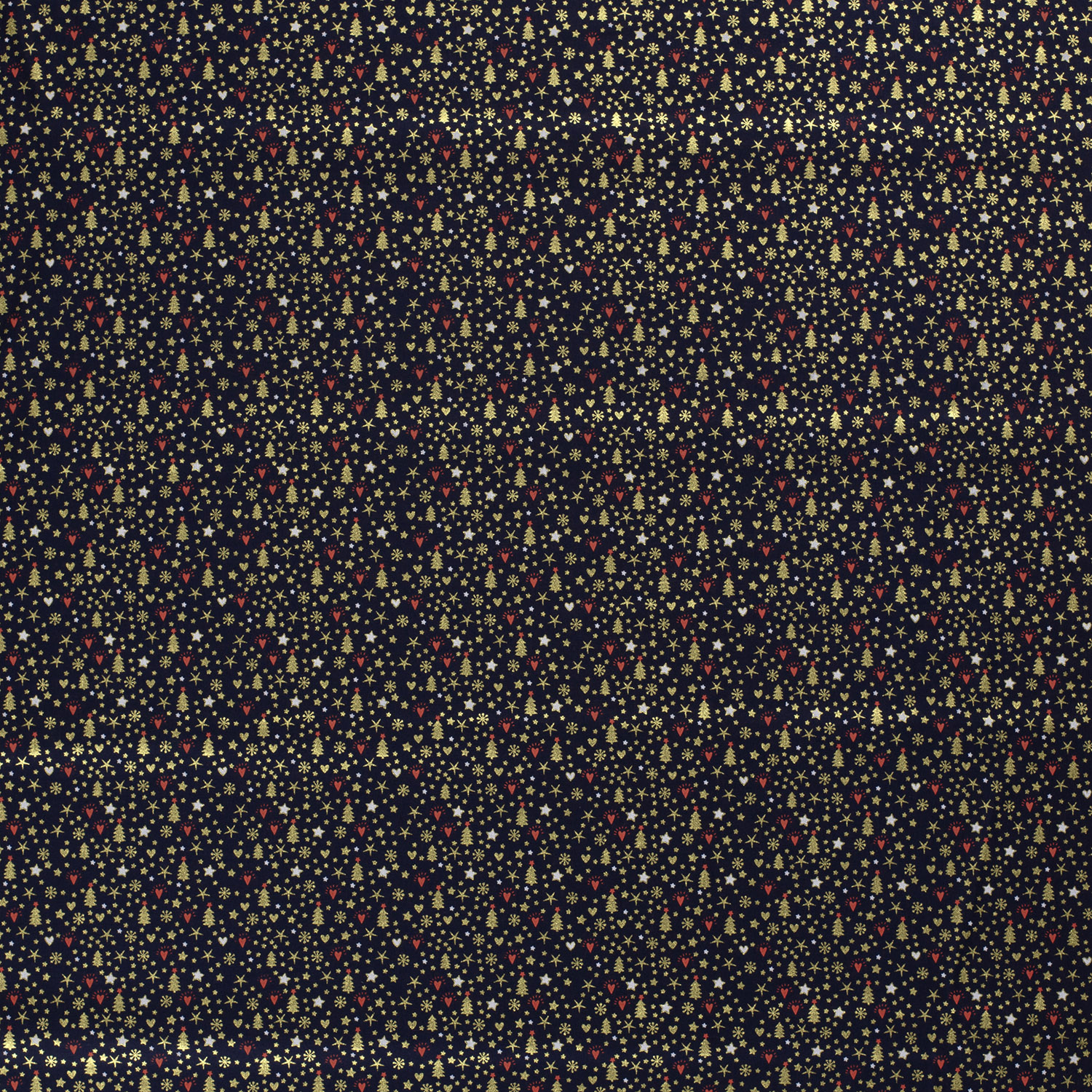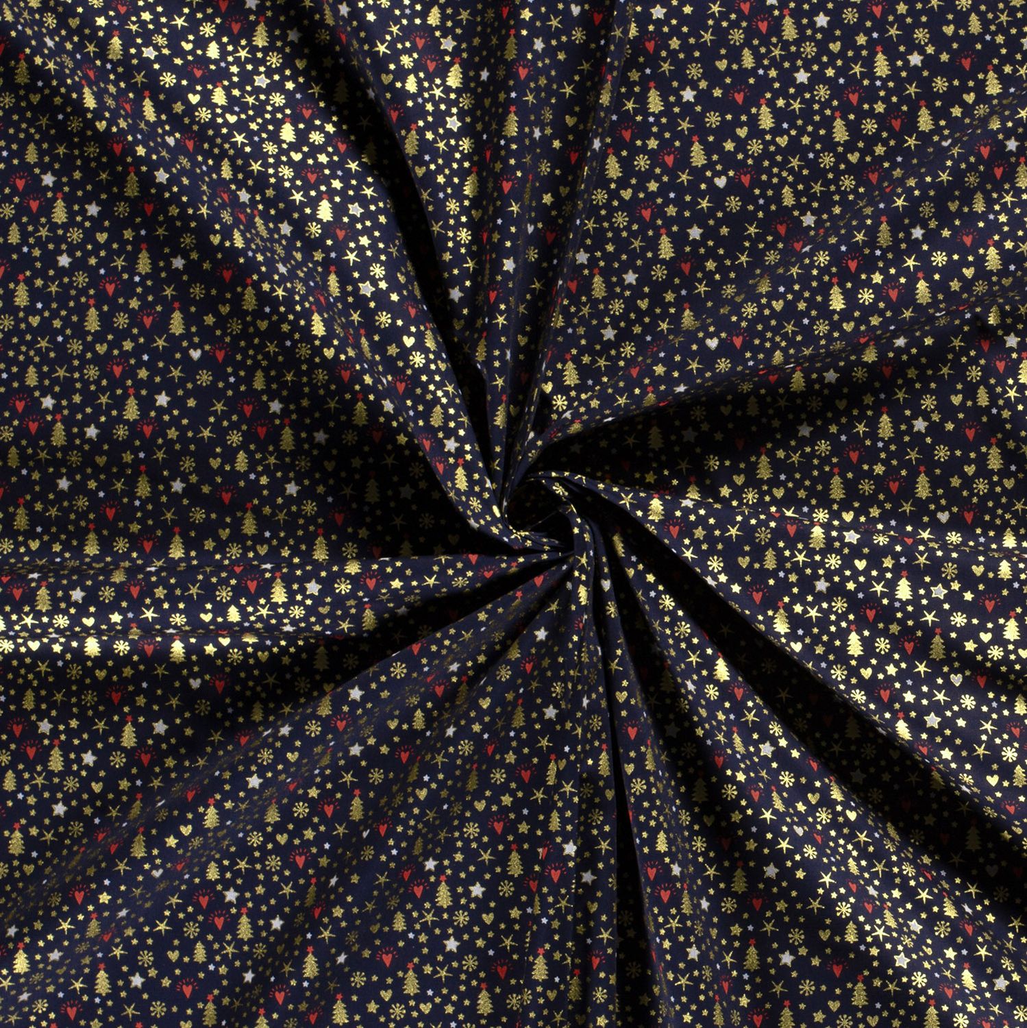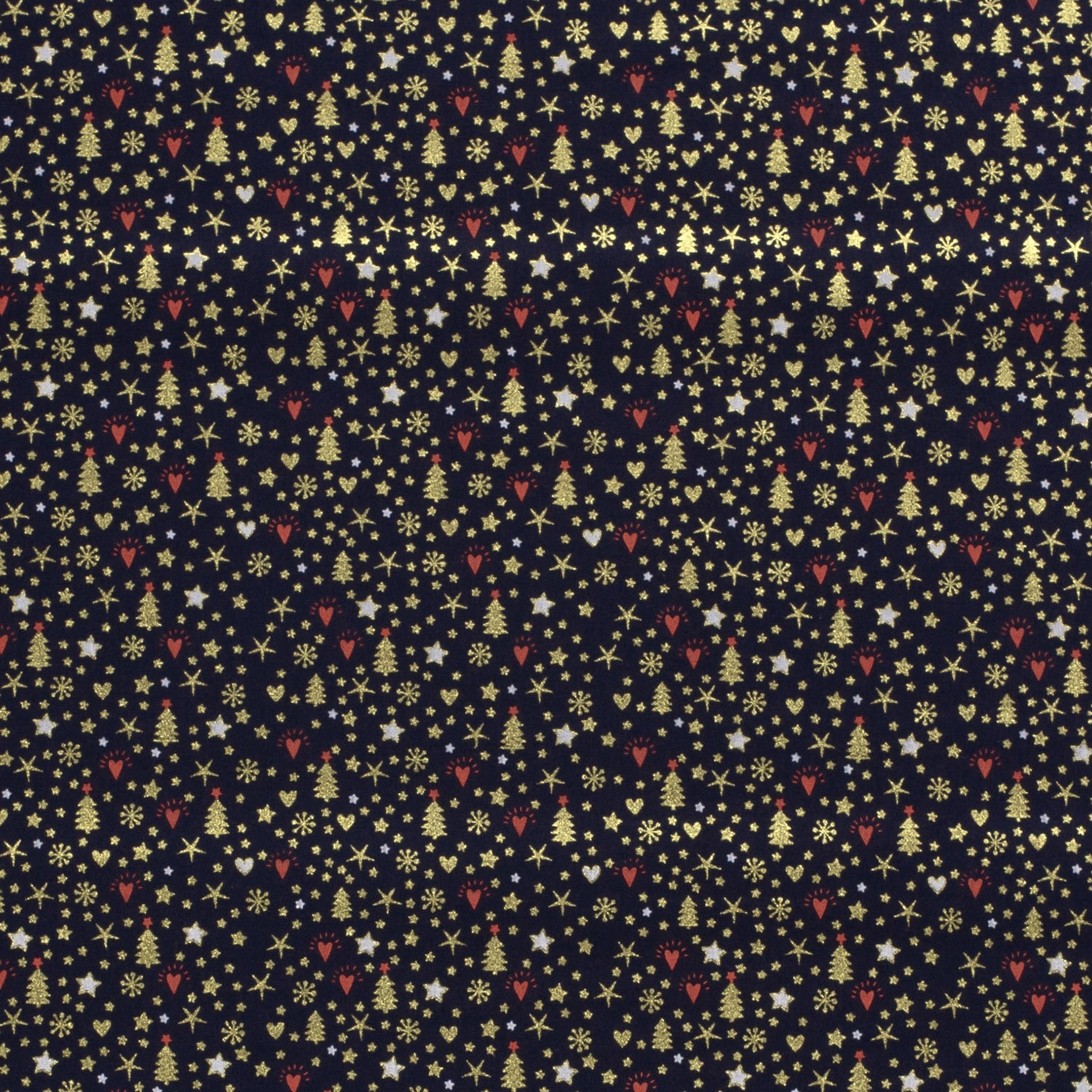 Slavnostní látka jako zimní noc plná světel: na tmavě modrém pozadí září jemné vánoční stromky ve zlaté barvě a drobné akcenty, jako jsou třpytivé hvězdy a tečky. Jemný design působí elegantně, moderně a zároveň úžasně útulně - ideální pro každého, kdo si chce stylově a zároveň hravě vyzdobit Vánoce.