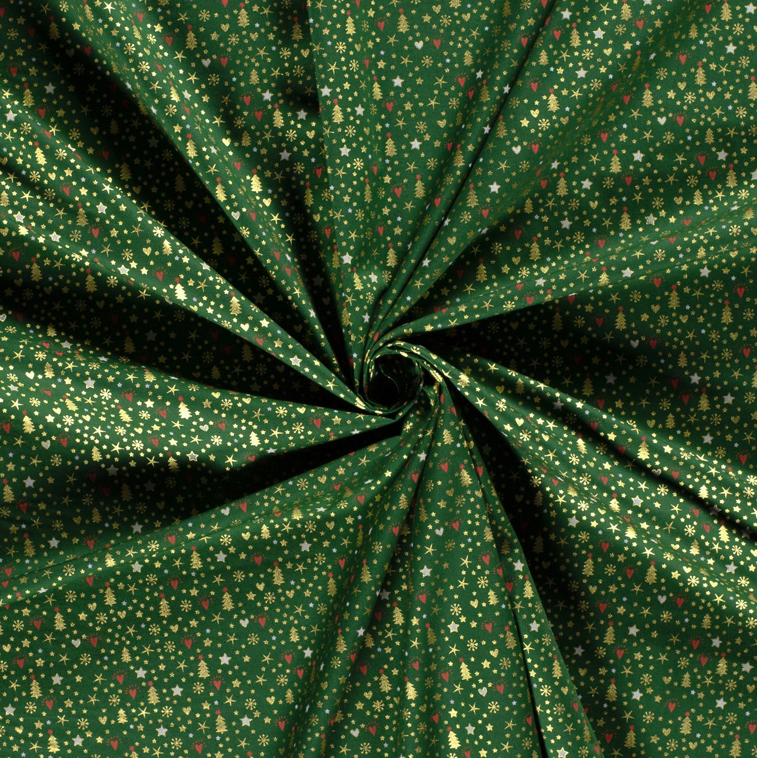 Látka jako ze zimního pohádkového lesa: jemné zlaté vánoční stromečky a jemné tečky září jako malé sněhové vločky na tmavě zeleném borovicovém pozadí. Elegantní zlatá se jemně třpytí a dodává designu sváteční a zároveň stylový nádech - ideální pro každého, kdo si rád udělá Vánoce elegantní a zároveň útulné. Tato popelínová látka je ideální pro vánoční nápady na šití: od atmosférických běhounů na stůl, ubrousků a dárkových tašek až po adventní kalendáře, povlaky na polštáře nebo sváteční dekorace v celém domě. Motiv se báječně hodí také na vánoční oblečení, jako jsou sukně, košile, halenky nebo dětské oblečky, a okamžitě navodí vánoční atmosféru. Díky harmonické souhře syté jedlové zeleně a elegantní zlaté bude tato látka ozdobou vašich vánočních dekorací a promění každý šicí projekt v něco výjimečného.