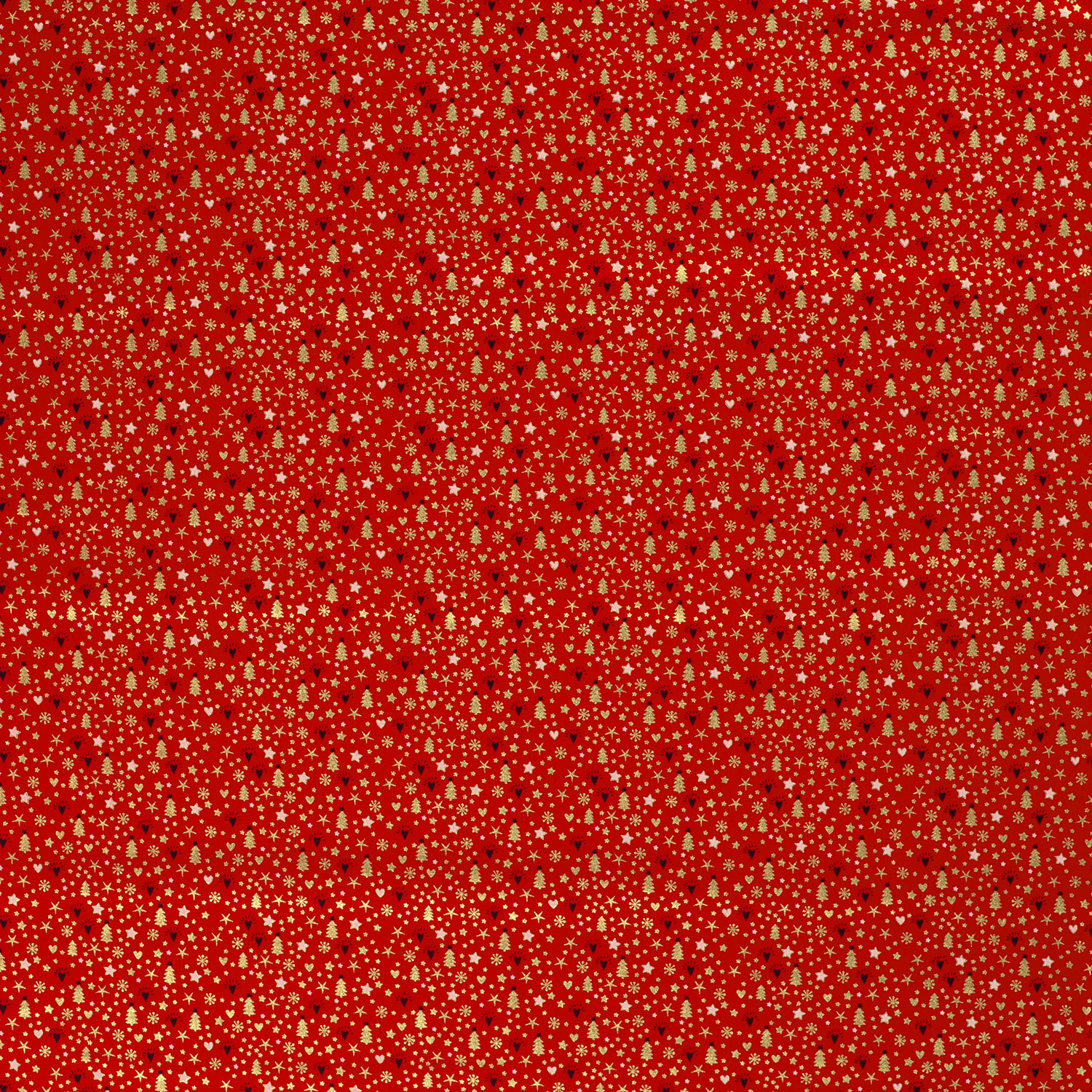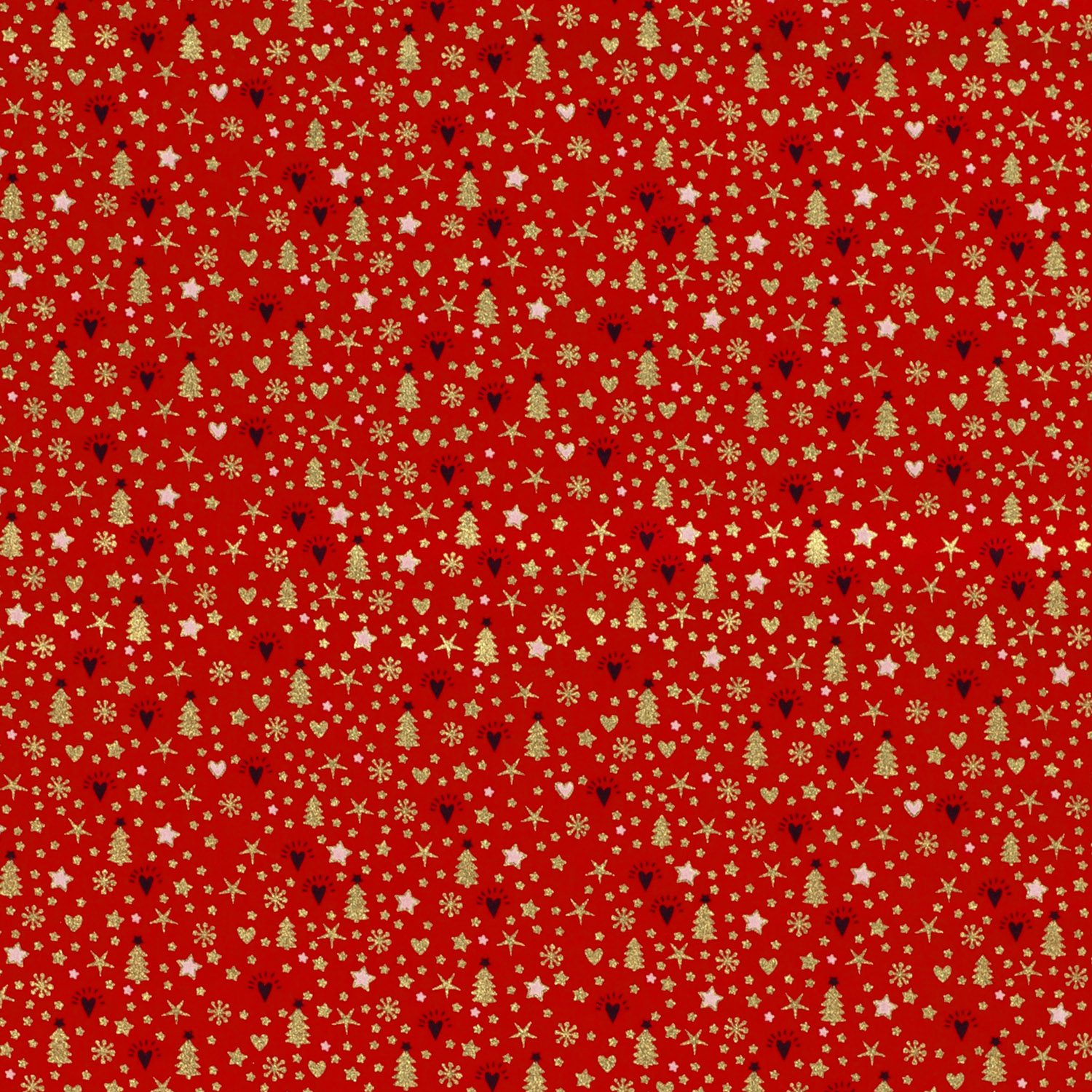 Tato slavnostní látka vykouzlí vánoční atmosféru v každém šicím projektu během chvilky. Jemně třpytivé pozadí je poseto malými stylizovanými vánočními stromečky v elegantní zlaté a teplé červené barvě - jako jemná záře světel na zimním pozadí. Jasné kontury vánočních stromků a harmonické barevné ladění dělají z této látky ideálního společníka pro adventní období: skvěle se hodí na s láskou ušité dárkové tašky, běhouny na stůl, ubrousky, povlaky na polštáře, ozdobné přívěsky nebo sváteční oblečení pro malé i velké. Ať už chcete stylově prostřít vánoční stůl, útulně vyzdobit domov nebo ozdobit osobní dárky speciální látkou - tento design kombinuje klasické vánoční barvy s moderním, elegantním vzhledem a vnese sváteční kouzlo do každého tvůrčího nápadu.