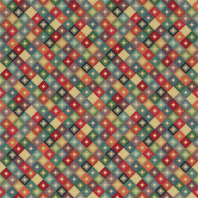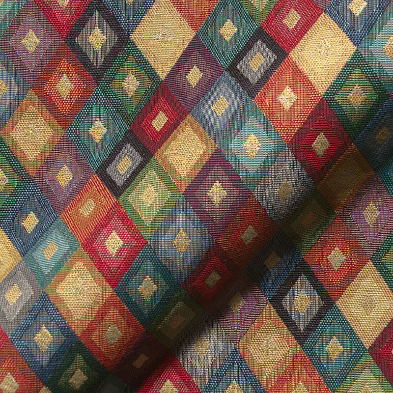 Tato elegantní tkanina upoutá pozornost každého: propracovaný vzor kostek v teplých vícebarevných tónech si pohrává s hloubkou a optickou 3D iluzí. Jemné odstíny krémové, béžové a šedé se setkávají se silnějšími akcenty v červené, modré a zelené, zatímco jemné zlaté akcenty dodávají vzoru luxusní lesk.