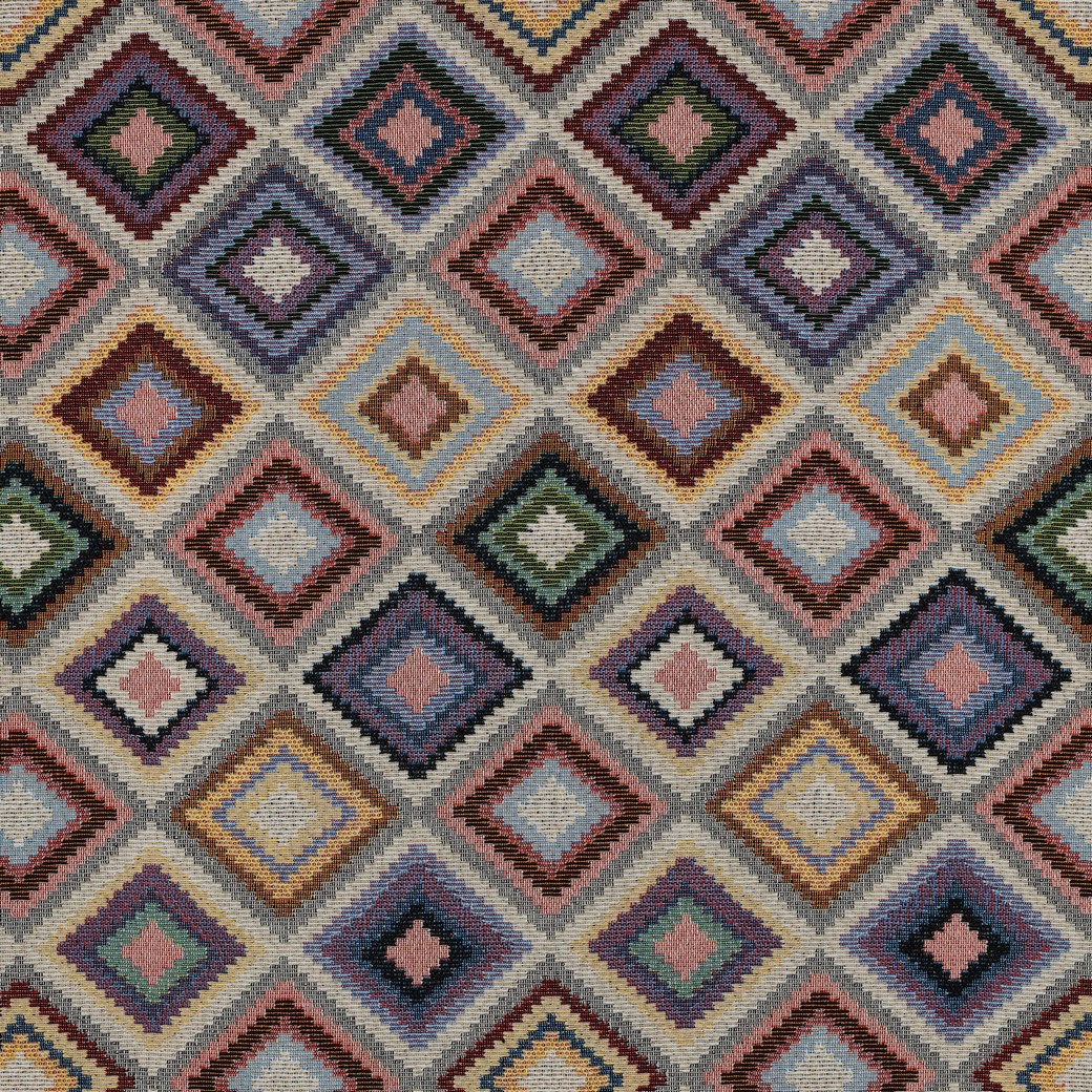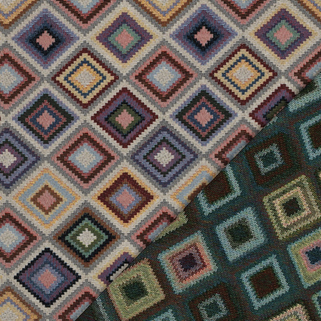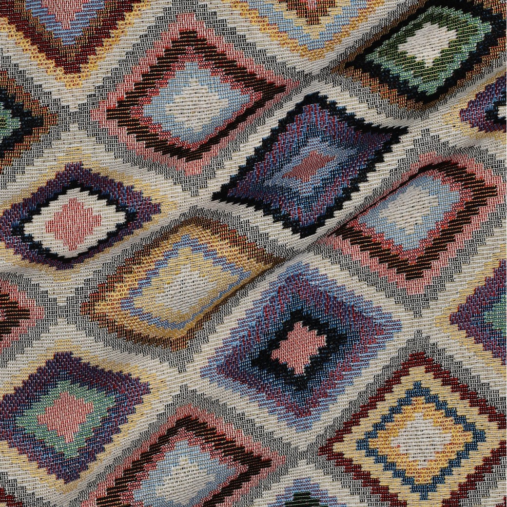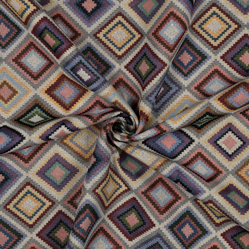 Hustě tkaná dekorační látka je robustní, tvarově stálá a díky žakárové vazbě má lehce strukturovaný povrch. Díky podílu polyesteru je látka odolná a snadná na údržbu, bavlna zase zajišťuje příjemný, textilní omak. Geometrický vzor s barevnými kosočtverci působí moderně a hodí se k mnoha stylům bydlení.