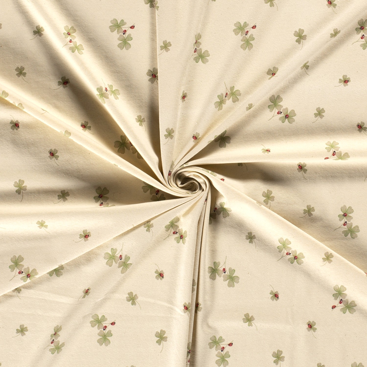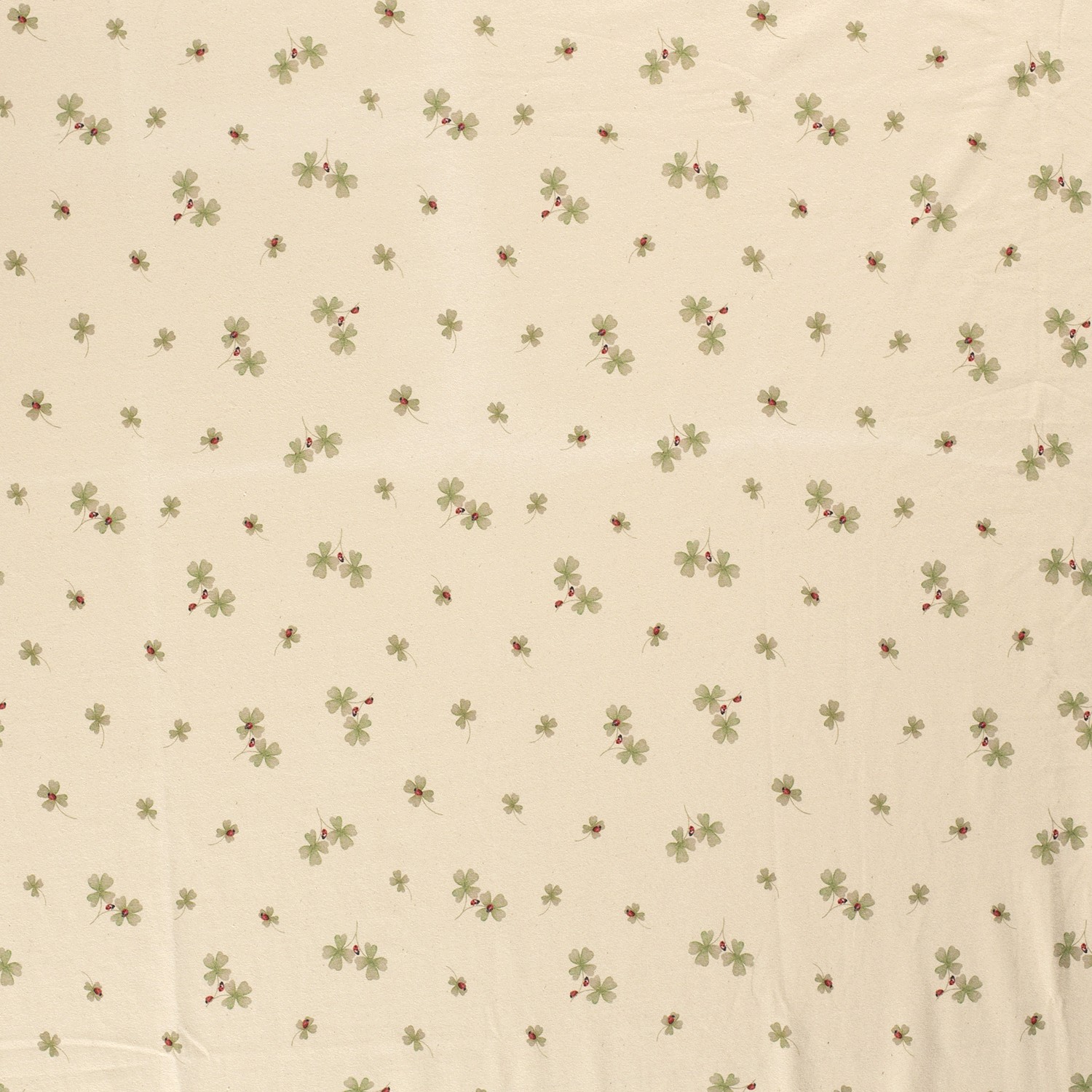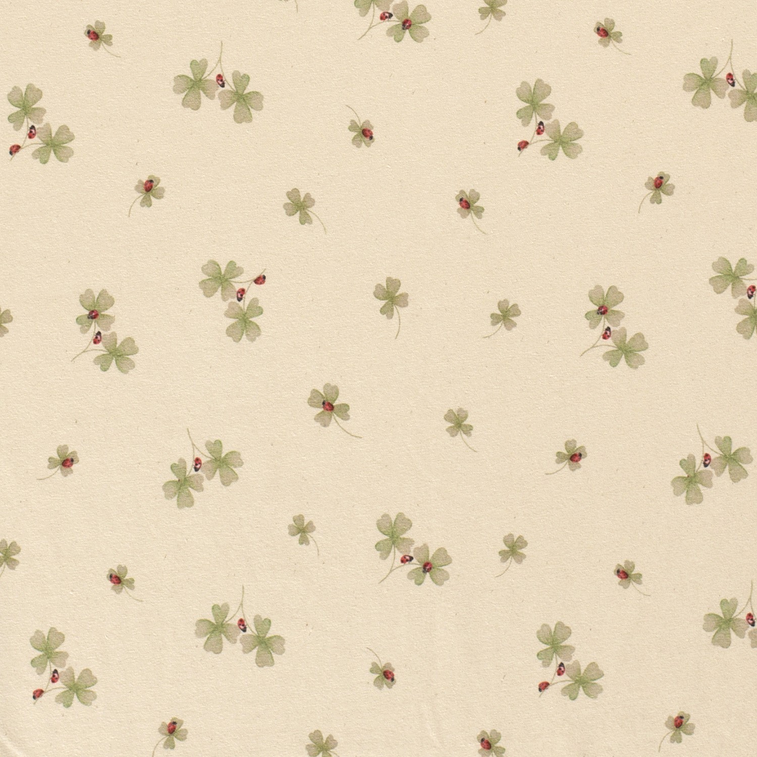 Jemný talisman pro vaše šicí projekty: Na světle béžovém pozadí se rozprostírají šťavnatě zelené čtyřlístky různých velikostí – mezi nimi pochodují malé červeno-černé berušky, které designu dodávají veselý a hravý akcent.