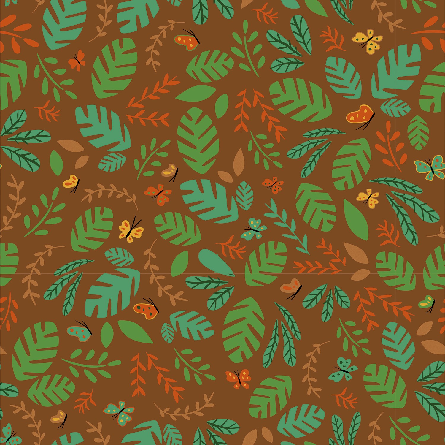 Nádech tropického pocitu pro tvé šicí projekty: Na teplé hnědé se hemží jemní motýli mezi bujnými palmovými listy a jemnými džunglovými rostlinami. Detailní listy v jemných zelených a přírodních tónech a filigránové motivy motýlů dodávají látce živý, ale přesto harmonický vzhled.