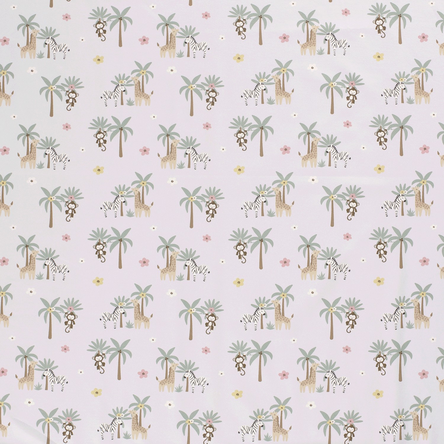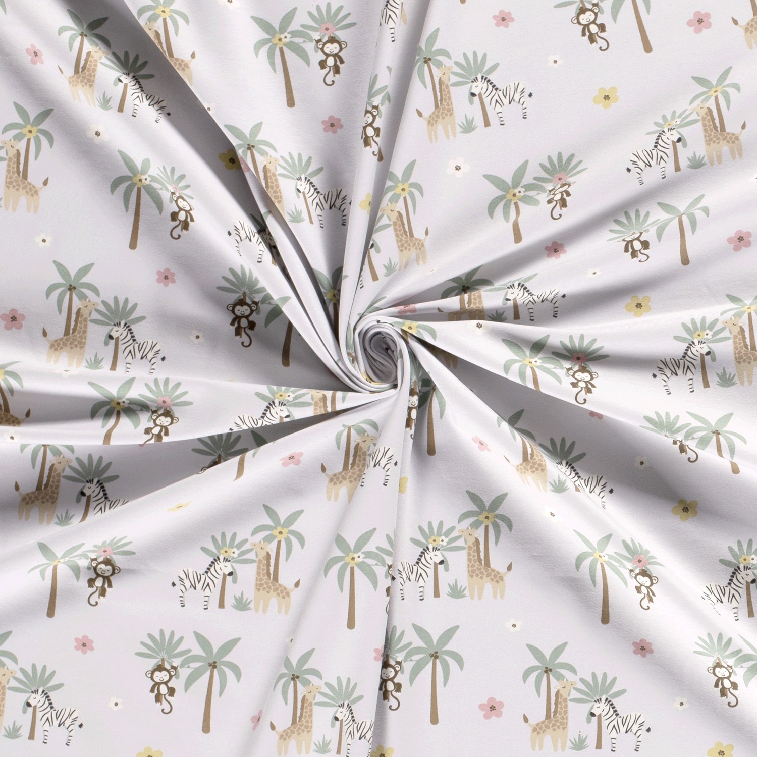 Dotek safari do šicího koutku: Na světle šedém pozadí se hemží veselá zvířata z zoo mezi palmami a listy. Roztomilé žirafy, sloni, lvi a spol. jsou láskyplně ilustrovány a laděny do jemných, harmonických barev – ideální pro ty, kteří milují hravé, ale ne příliš barevné vzory.