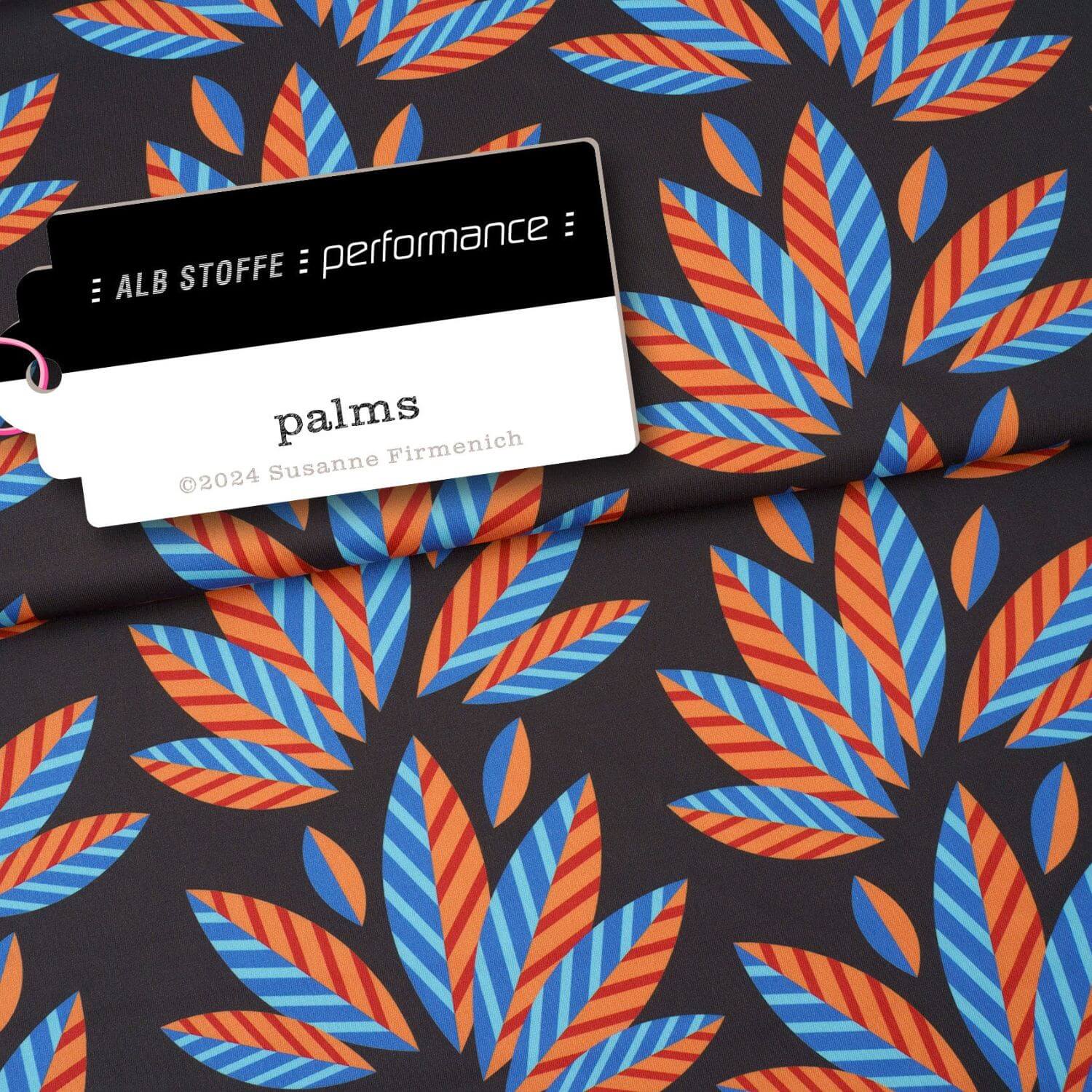 Kouzlo černé palmy pro vaše aktivní oblečení: tento design z kolekce Albstoffe performance má stylizované palmové listy v sofistikovaném černém odstínu, které se na látce vlní jako moderní stínový potisk. Vzhled je čistý, grafický a přitom hravý - ideální, pokud máte rádi sportovní oblečení, které nepůsobí barevně, ale chladně a sebevědomě.