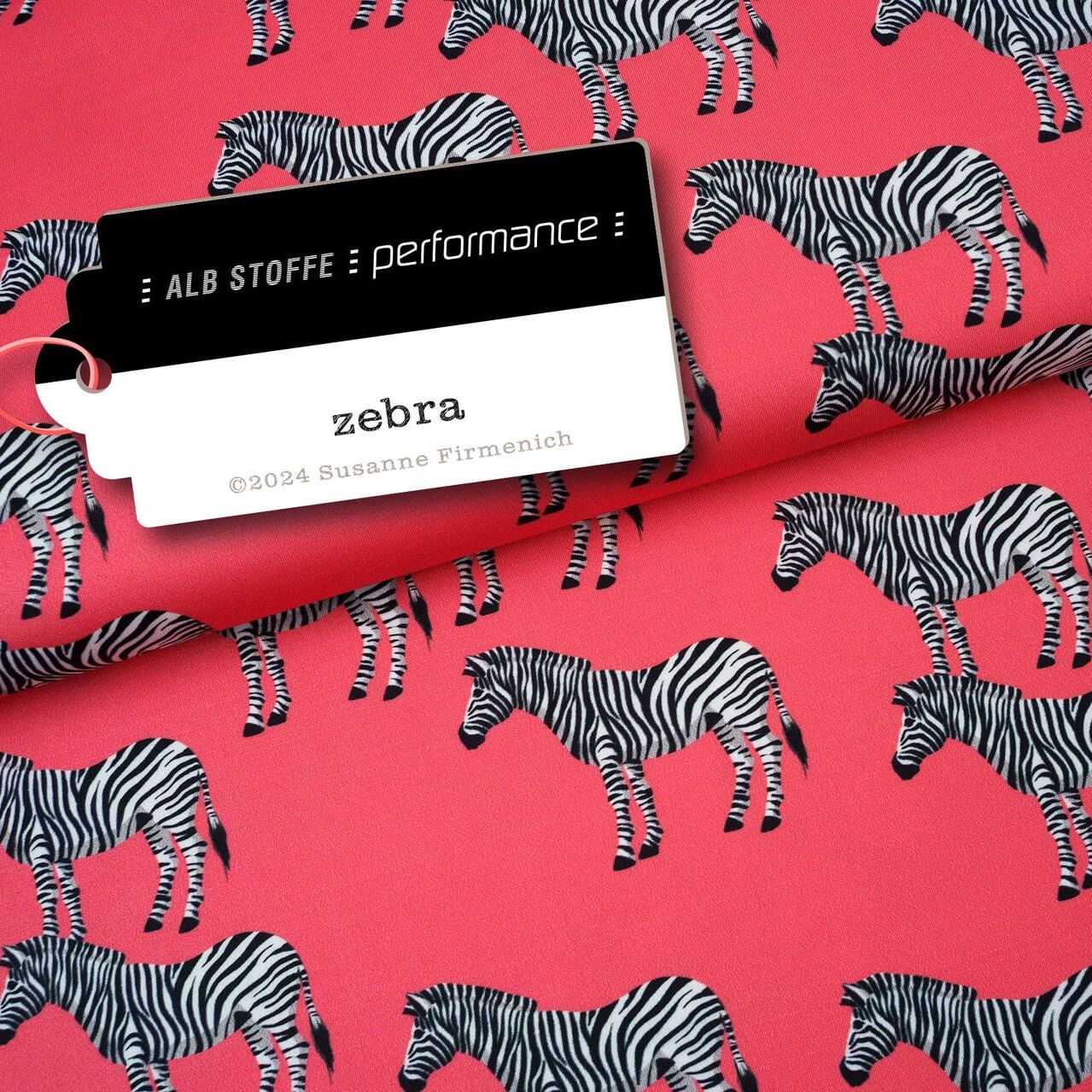 S kolekcí "Zebra Peach" z kolekce Albstoffe Performance můžete do svého sportovního šatníku vnést čistou energii. Dynamický zebří vzor v teplých broskvových a meruňkových tónech je protkán jemnými tmavými kontrasty, což mu dodává ženský, sportovní a naprosto moderní vzhled.