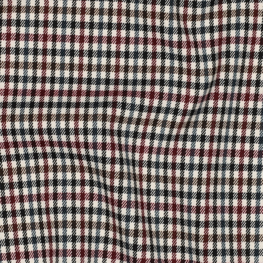 Tato elegantní kalhotovina zaujme jemnou drobnou kostkou, která dokonale spojuje nadčasovou klasiku a moderní ležérnost. Kombinace hluboké černé, teplé ecru a decentního červeného akcentu dává vzoru živý, ale přesto stylový vzhled – ideální pro ty, kteří milují jednoduché designy s detailem.