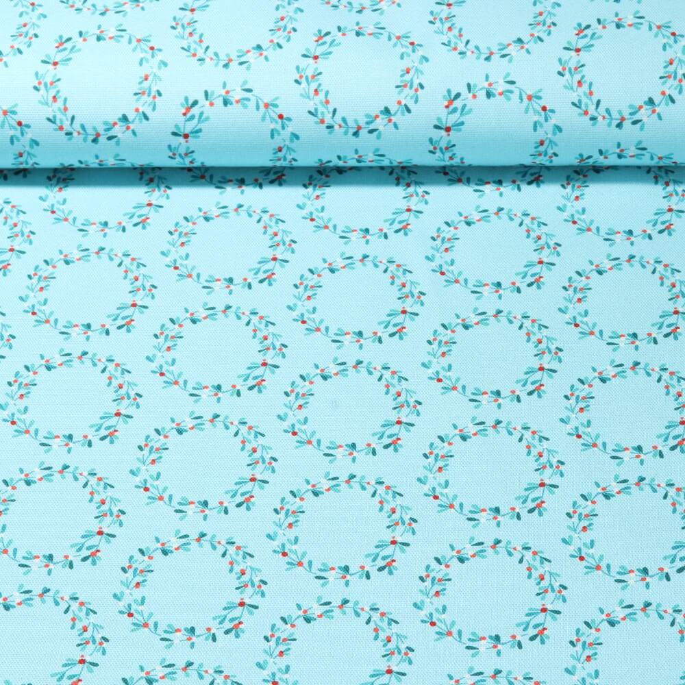 Slavnostní vánoční nálada v jemných pastelových odstínech: na světle modrém pozadí této vysoce kvalitní plátěné látky se proplétají láskyplně navržené vánoční věnce zdobené jemnými lístky, bobulemi a stylizovanými květy. Jemné červené, zelené a přírodní tóny propůjčují vzoru hřejivý, útulný nádech, zatímco drobné ozdobné detaily dodávají vzoru moderní, hravou lehkost.