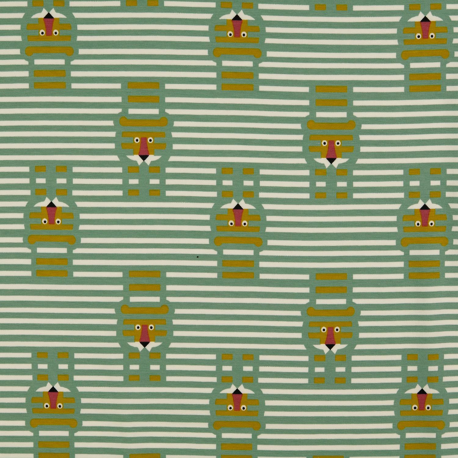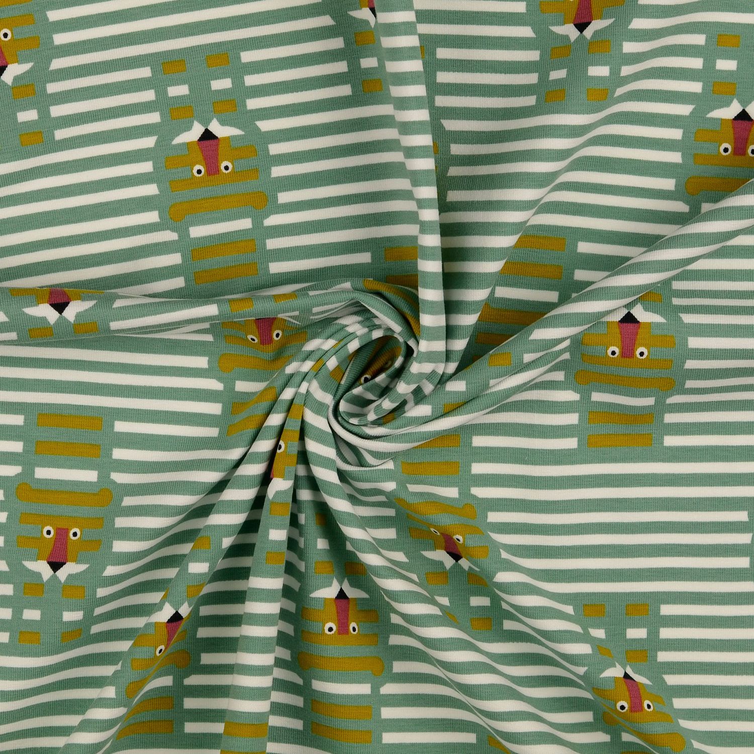 Malý král savany na jemných pruzích – tento džersey okouzlí svým roztomilým motivem. Na moderním tmavě mátovém pozadí se střídají jemné, nenápadné pruhy, na kterých se sladký lev s korunkou stává středem pozornosti. Harmonická barevná kombinace tmavě mátové, teplých přírodních tónů a jemných akcentů činí látku ideální pro dětské a kojenecké oblečení.