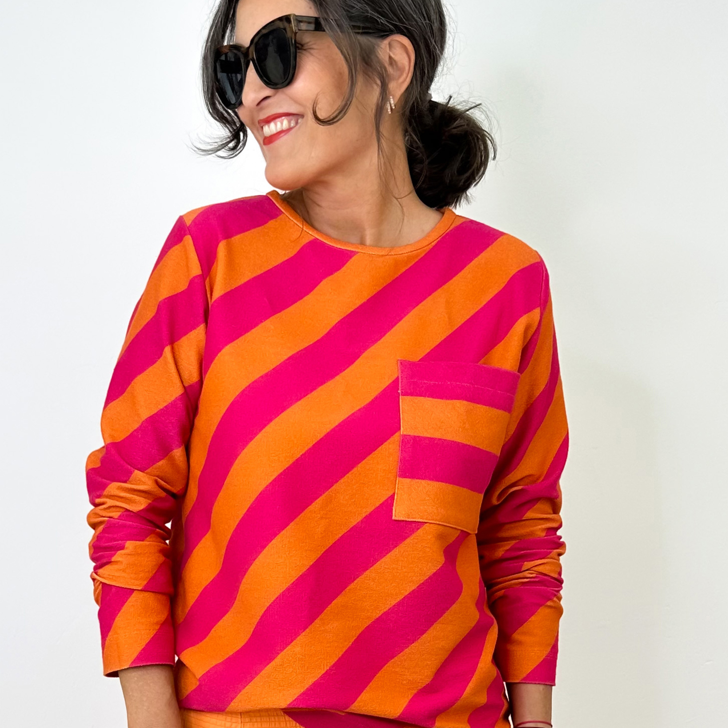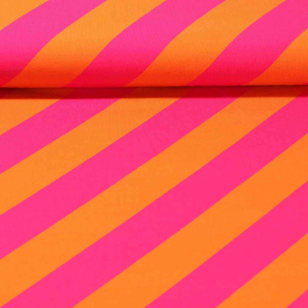 Látka jako východ slunce: zářivá oranžová se setkává s živou fuchsií a okamžitě vám dodá dobrou náladu. Vzor vypadá jako jemné barevné vlny, které harmonicky přebíhají po látce - moderní, veselý a naprosto přitažlivý.
