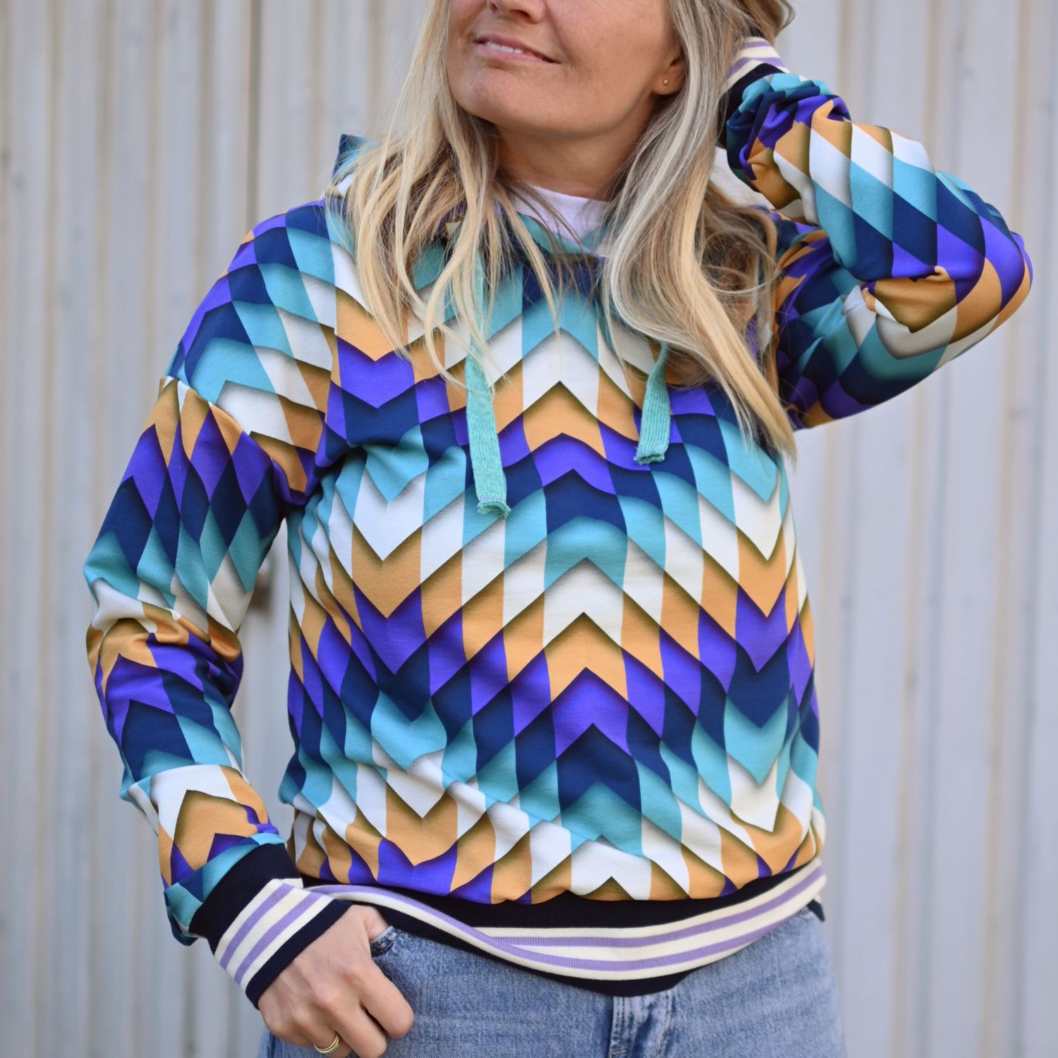 Obzvlášť krásné: podél jednoho okraje látky se táhne umístěný lem, který vypadá jako malá kulisa. Je ideální pro působivé zvýraznění lemů, kapucí, manžet nebo poutavých předních dílů. Vezměte prosím na vědomí, že tento lem zmenšuje užitnou šířku látky o přibližně 15 cm.