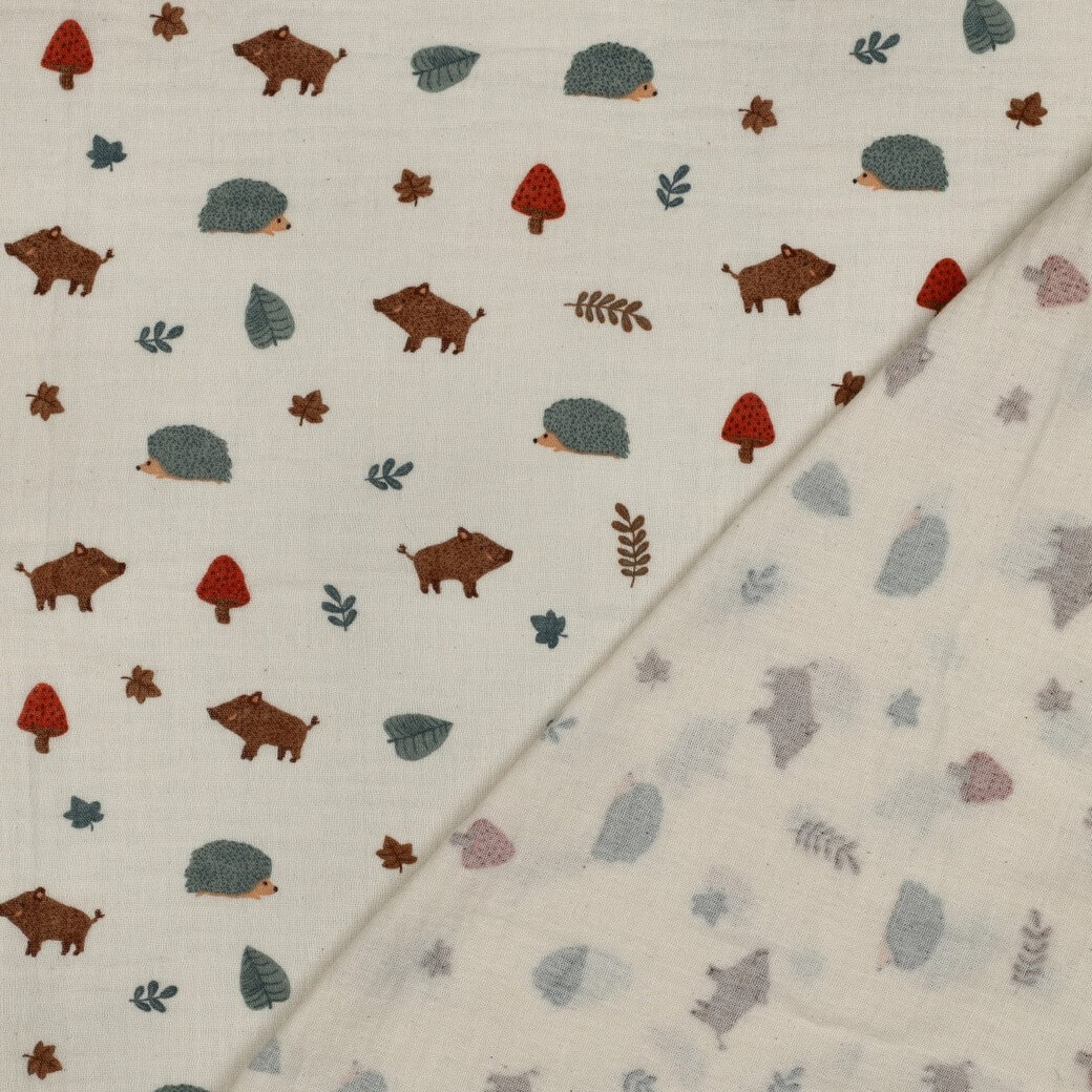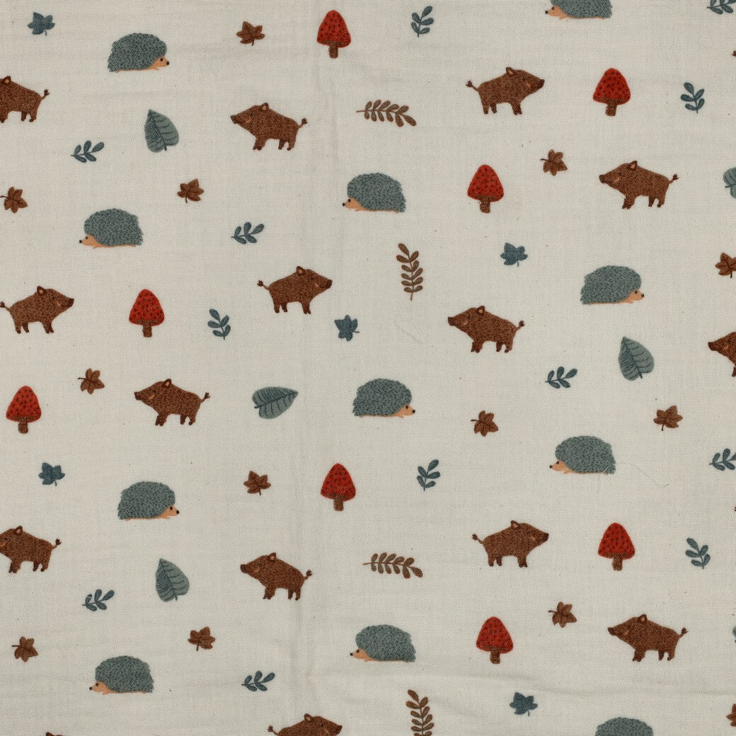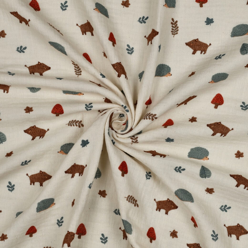 Okouzlující organický mušelín s láskyplně nakreslenými lesními zvířaty na přírodním, krémovém pozadí. Srnky, lišky, ježci, veverky a drobní ptáčci dovádějí mezi jemnými listy a větvičkami - v teplých hnědých a béžových tónech, jemné šedé a měkkých přírodních barvách. Jemné, harmonicky sladěné barvy působí uklidňujícím a zároveň hravým dojmem.
