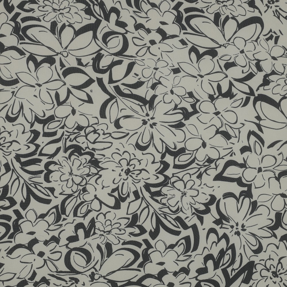 Jemný šifon s elegantní květinovou výzdobou: Na světlém ecru podkladu se rozvíjejí jemné, stylizované květy v hluboké černé a jemných šedých odstínech. Květinové motivy působí jako jemně nakreslené a dodávají látce ušlechtilou, téměř vznášející se lehkost.