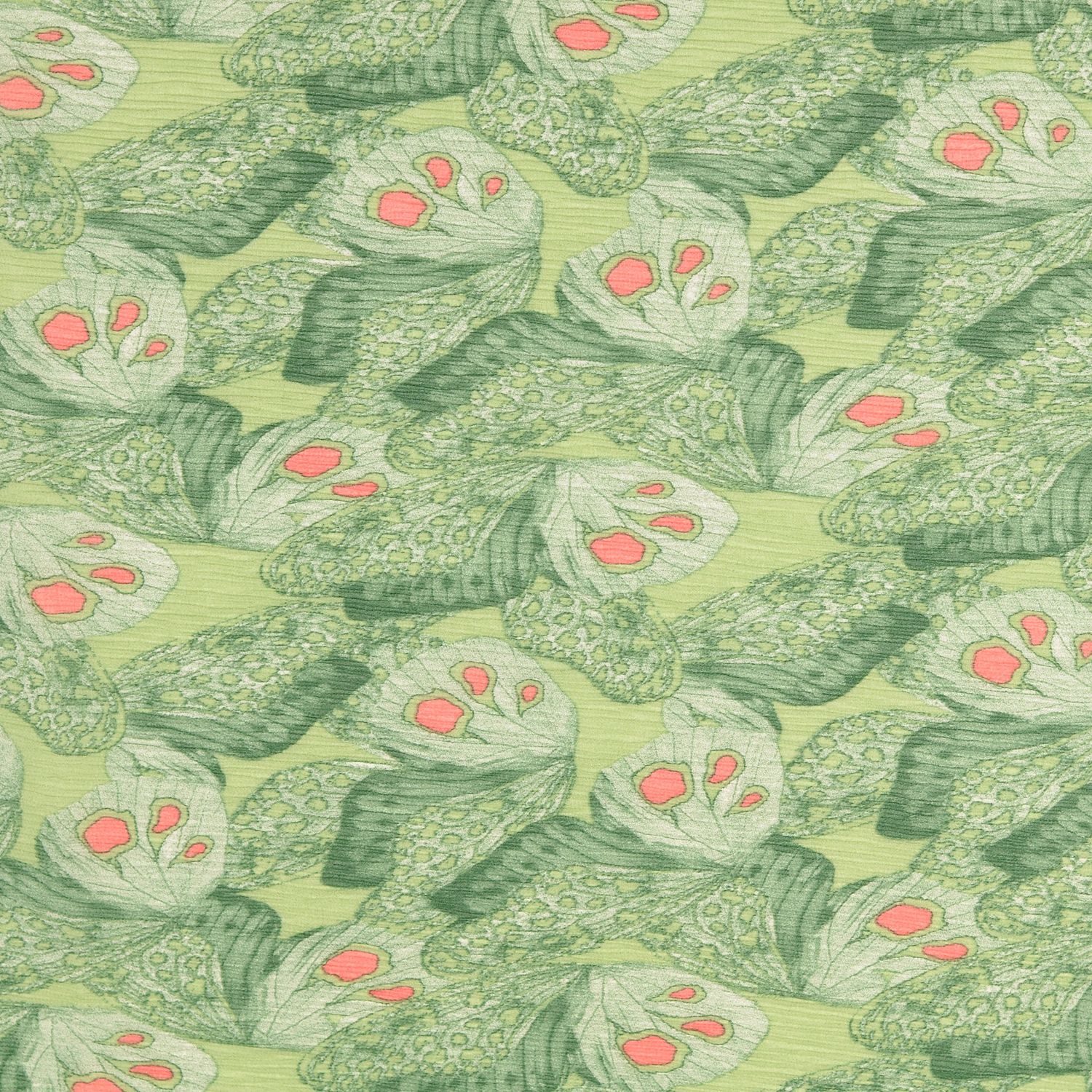 Lehkost a romantika: Na tomto jemném šifonu tančí jemní motýli v harmonických zelených odstínech na jemně lesklém světlém pozadí. Jemná plisovaná struktura dodává látce krásný, živý povrch – při každém pohybu vznikají elegantní světelné a stínové efekty, které motýlí potisk zviditelňují.