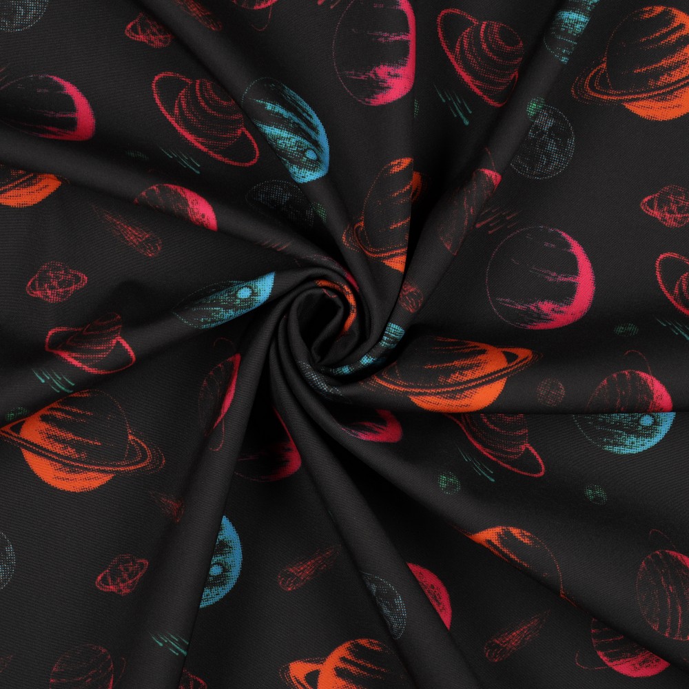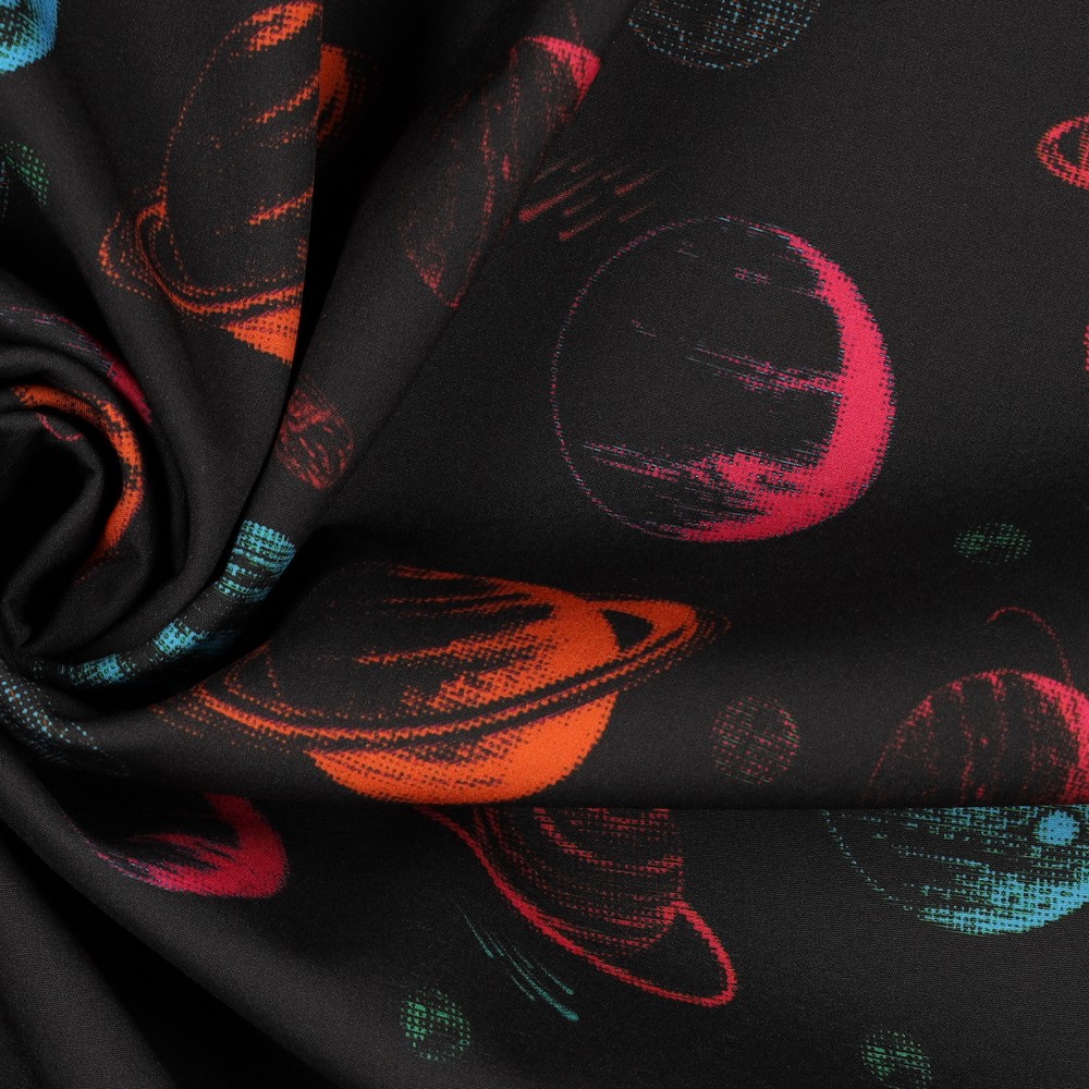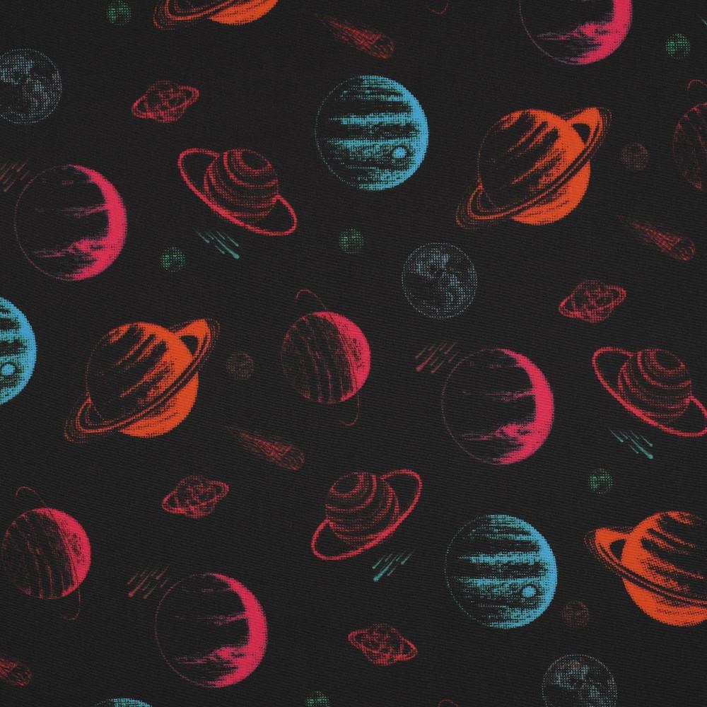 Látka jako z vzdálené galaxie: Na hluboce černém pozadí září barevné planety, měsíce a hvězdy v růžové, fialové, modré a jemných pastelových odstínech. Moderní digitální tisk zvýrazní každý detail – od malých padajících hvězd až po fantazijní nebeská tělesa, která vypadají jako plovoucí umělecká díla.