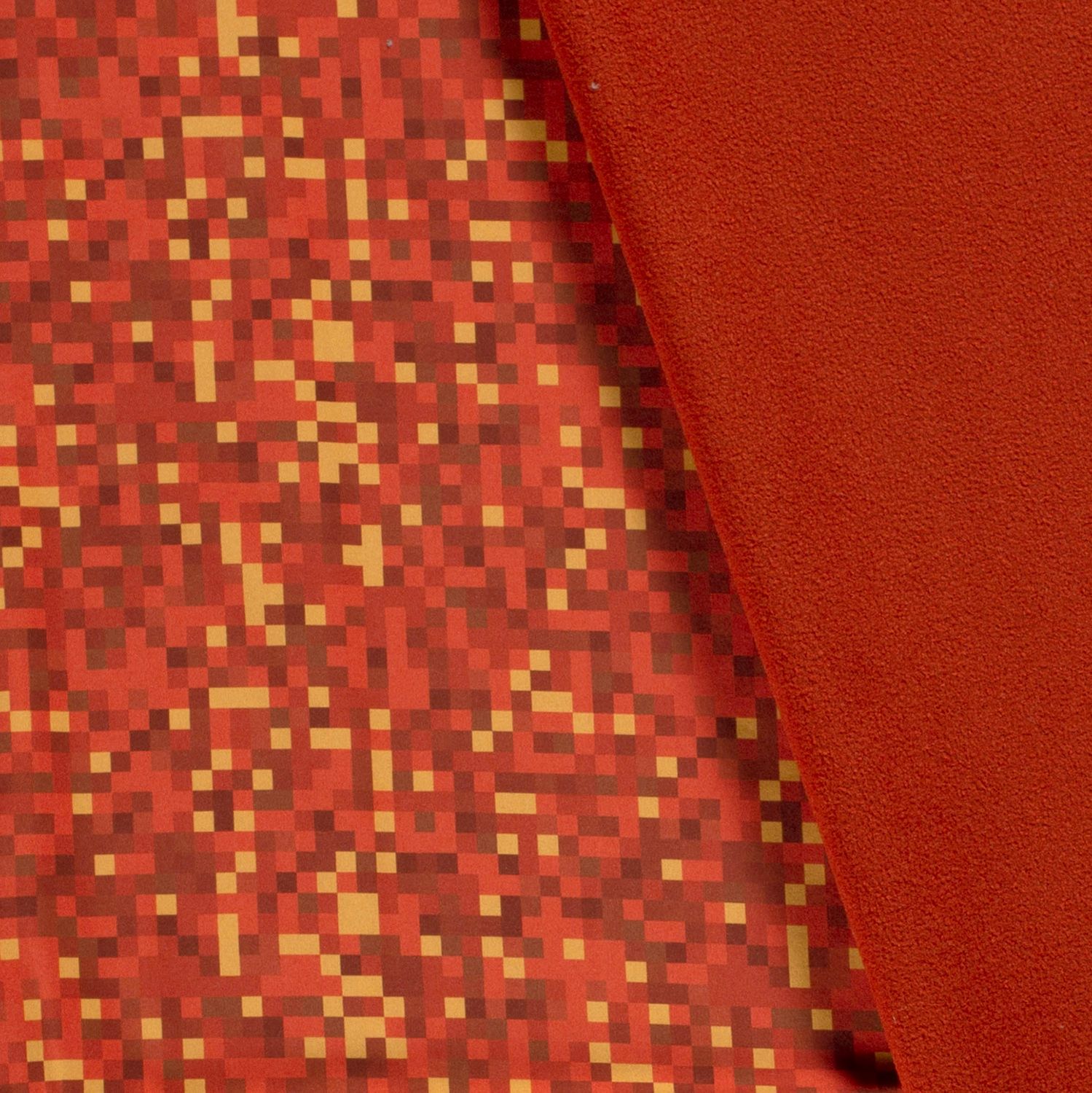 Textilie jako zářící pixelový ohňostroj: tento softshell zaujme moderním digitálním tiskem v sytých červených a oranžových tónech, protkán tmavými akcenty. Stylizovaný pixelový vzhled připomíná abstraktní městská světla nebo dynamickou počítačovou hru – ideální pro ty, kdo mají rádi výrazný a městský styl.