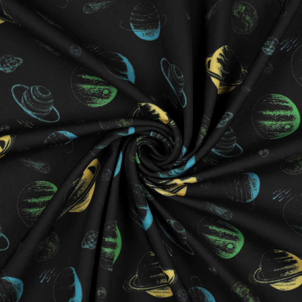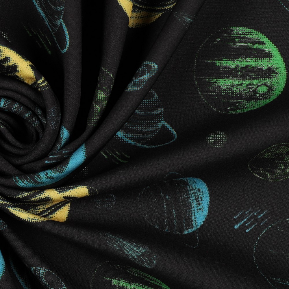 Moderní, kontrastní design činí látku poutačem pro malé i velké. Perfektní pro stylové bundy, overal, nepromokavé kalhoty, batohy nebo doplňky, které nejsou jen praktické, ale také opravdovým prohlášením. Ať už pro malé vesmírné fanoušky nebo všechny, kdo milují grafické, neobvyklé vzory: Tento softshell přináší kosmický šarm do každého šicího projektu.