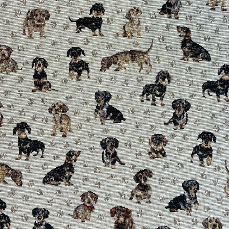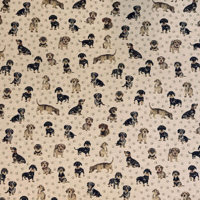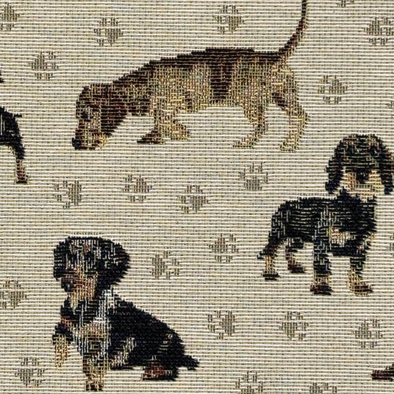 Tato elegantní tkanina upoutá pozornost každého svým láskyplně navrženým motivem jezevčíka. Na teplém béžovém pozadí skotačí malí jezevčíci v různých pózách a barvách - utkaní do nejmenších detailů, s viditelnou strukturou srsti a jemnými konturami. Harmonická barevná paleta béžové, hnědé, černé a jemných přírodních tónů působí nadčasově a bez námahy se začlení do mnoha interiérových stylů.