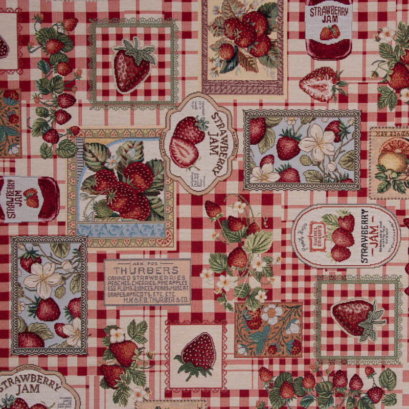 Tato elegantní tkanina okouzlí láskyplně navrženým motivem jahodového džemu na teplém béžovém pozadí. Šťavnaté červené jahody, drobné lístky a detailně propracované sklenice s džemem se na neutrálním pozadí vyjímají a připomínají útulné chvíle u snídaně v kuchyni venkovského domu.